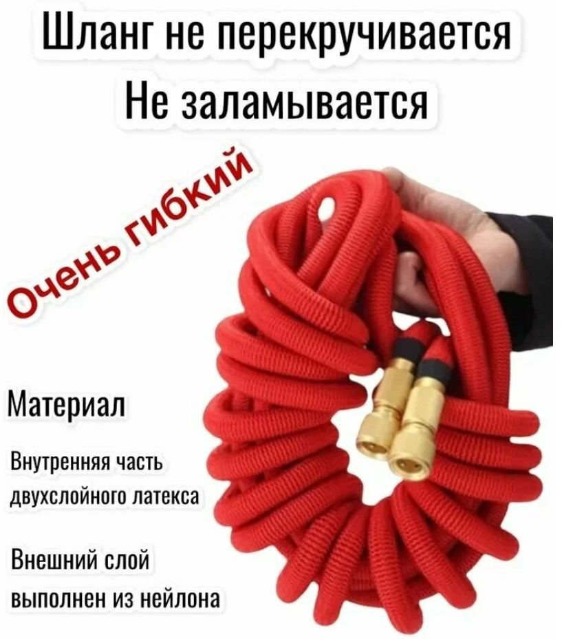 Шланг садовый растягивающийся 50 метров, с распылителем 7 режимов, PREMIUM качество, с металлическим соединением 3/4, для полива, красный, шланг дачный