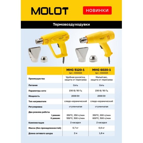 Комплект 2 штук, Термовоздуходувка MOLOT MHG 5120 в кор. + набор сопл 2000 Вт, 2 скор., 350-550 °С (Ступенч. рег., 300-500 л/мин) (MHG5120K0022)