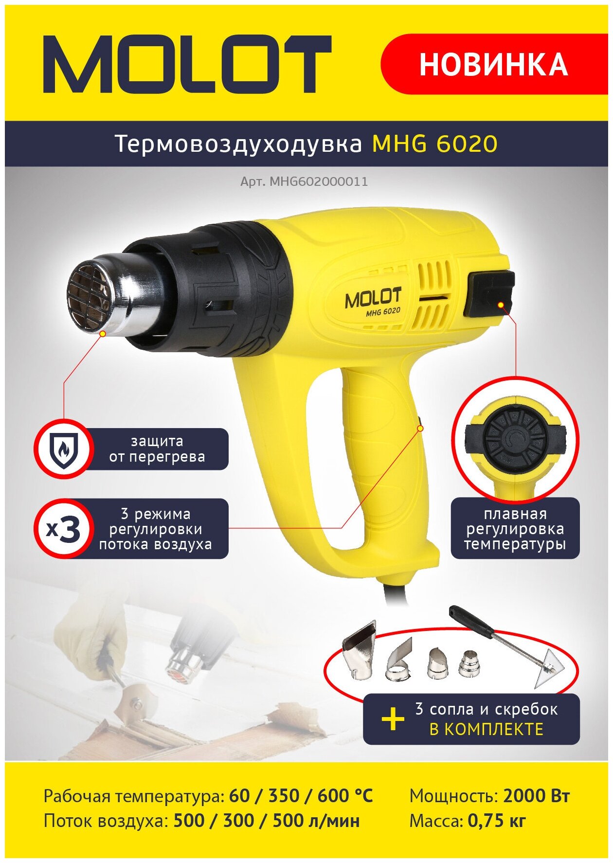 Купить Фен строительный (термовоздуходувка) с 4 насадками MOLOT MHG 6020 (MHG602000011)