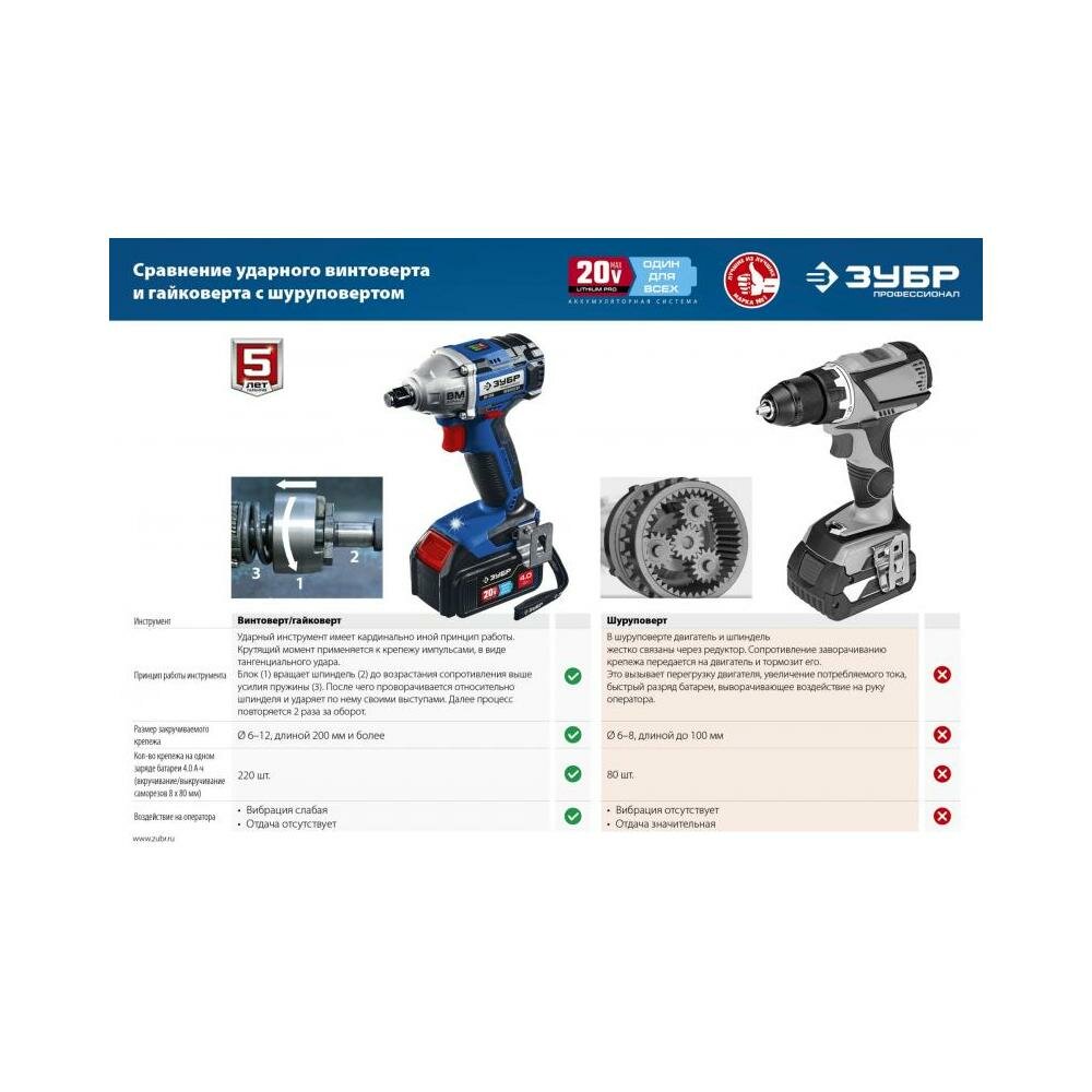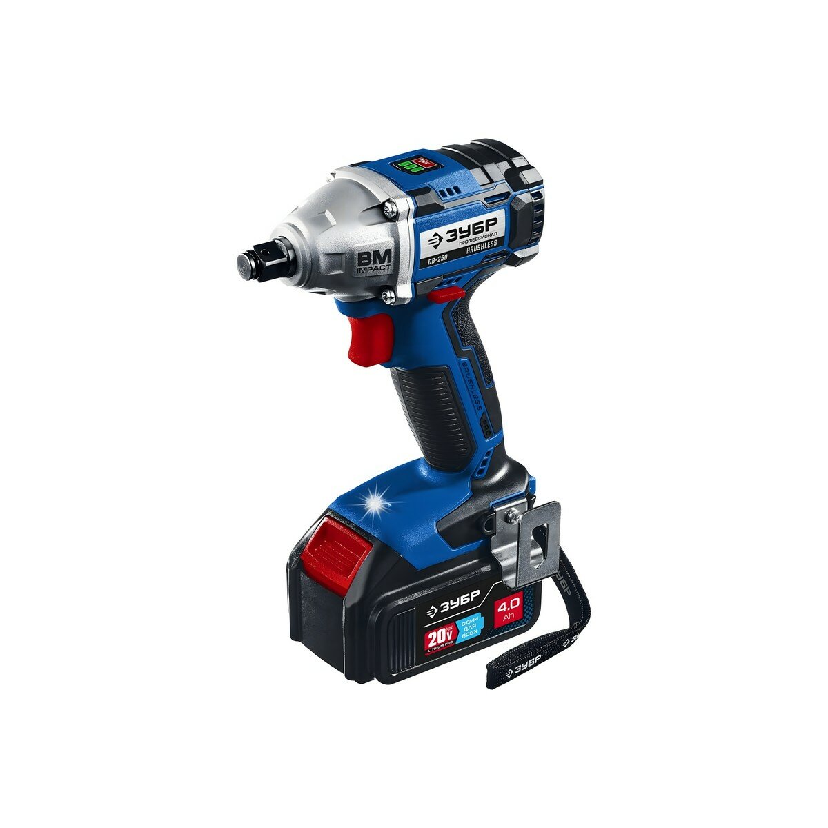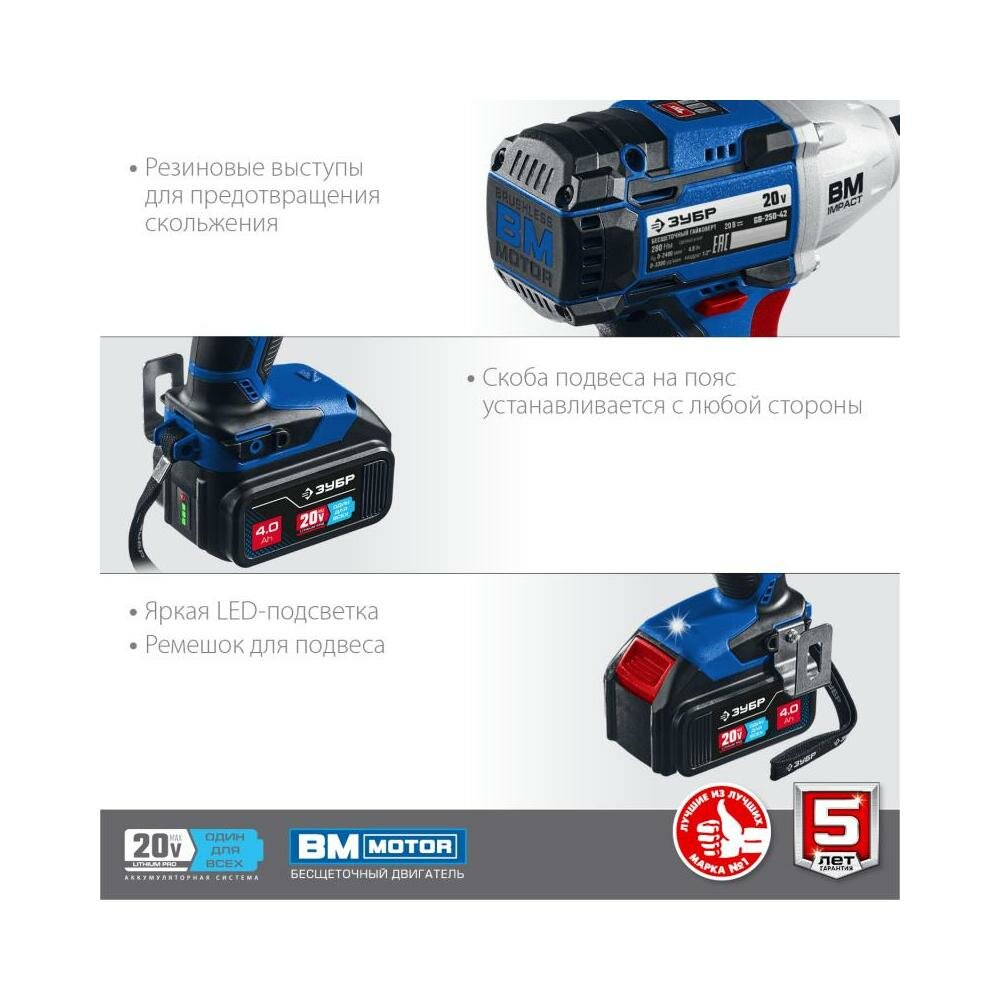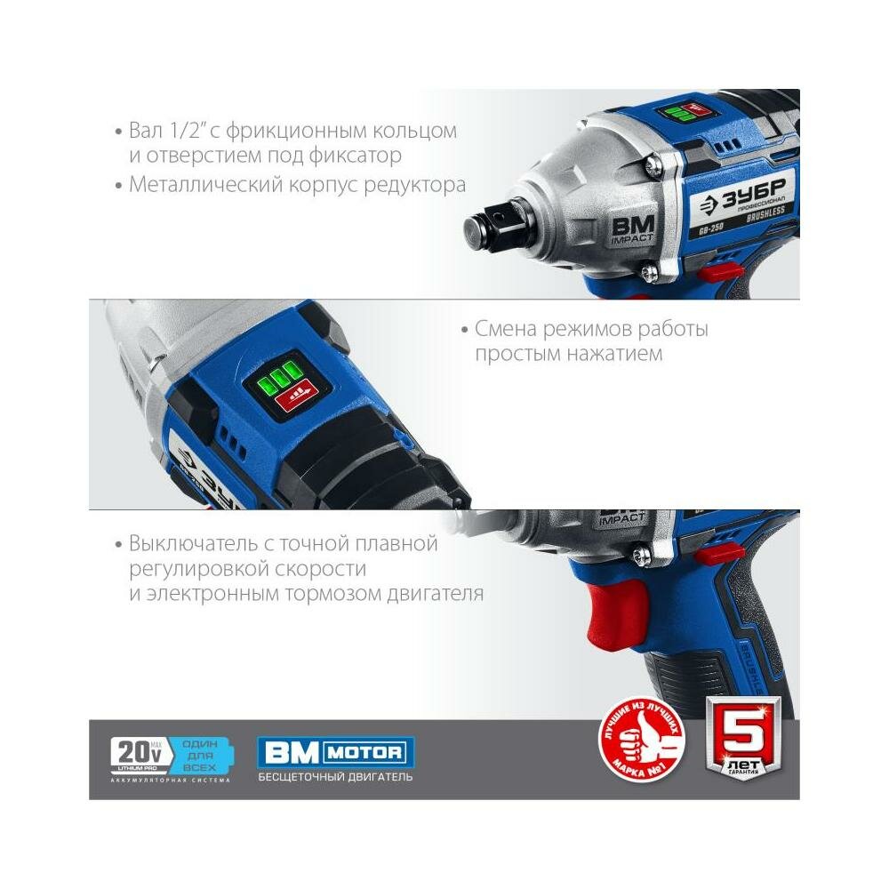 Гайковерт аккумуляторный ударный бесщеточный Зубр GB-250 (GB-250-22) 20В 2Ач Li-Ion 2 АКБ и ЗУ