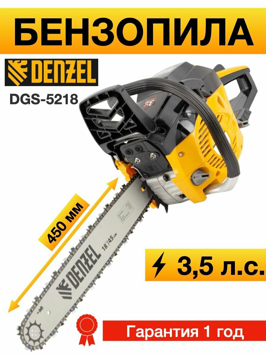 Пила цепная бензиновая DENZEL DS-5218, шина 45 см, 52 см3, 3 л. с, шаг 0,325, 72 звена