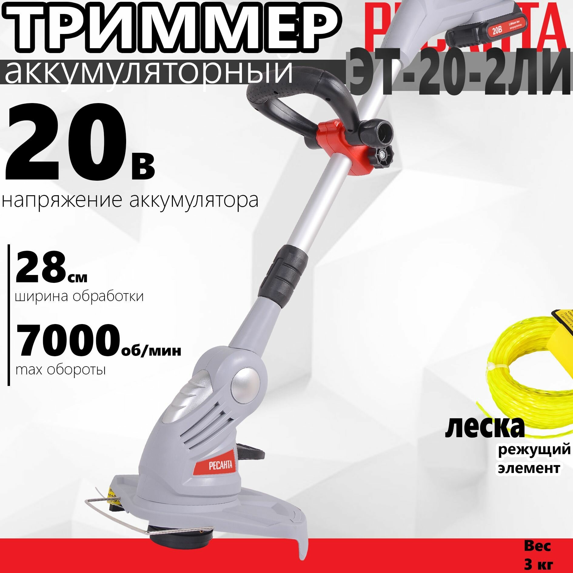 Купить Аккумуляторный триммер / электротриммер Ресанта ЭТ-20-2ЛИ (20 В, 2 Ач, Li-ion, 7000 об/мин, скашивание леской - 28 cм, Ø – 1.2 мм)