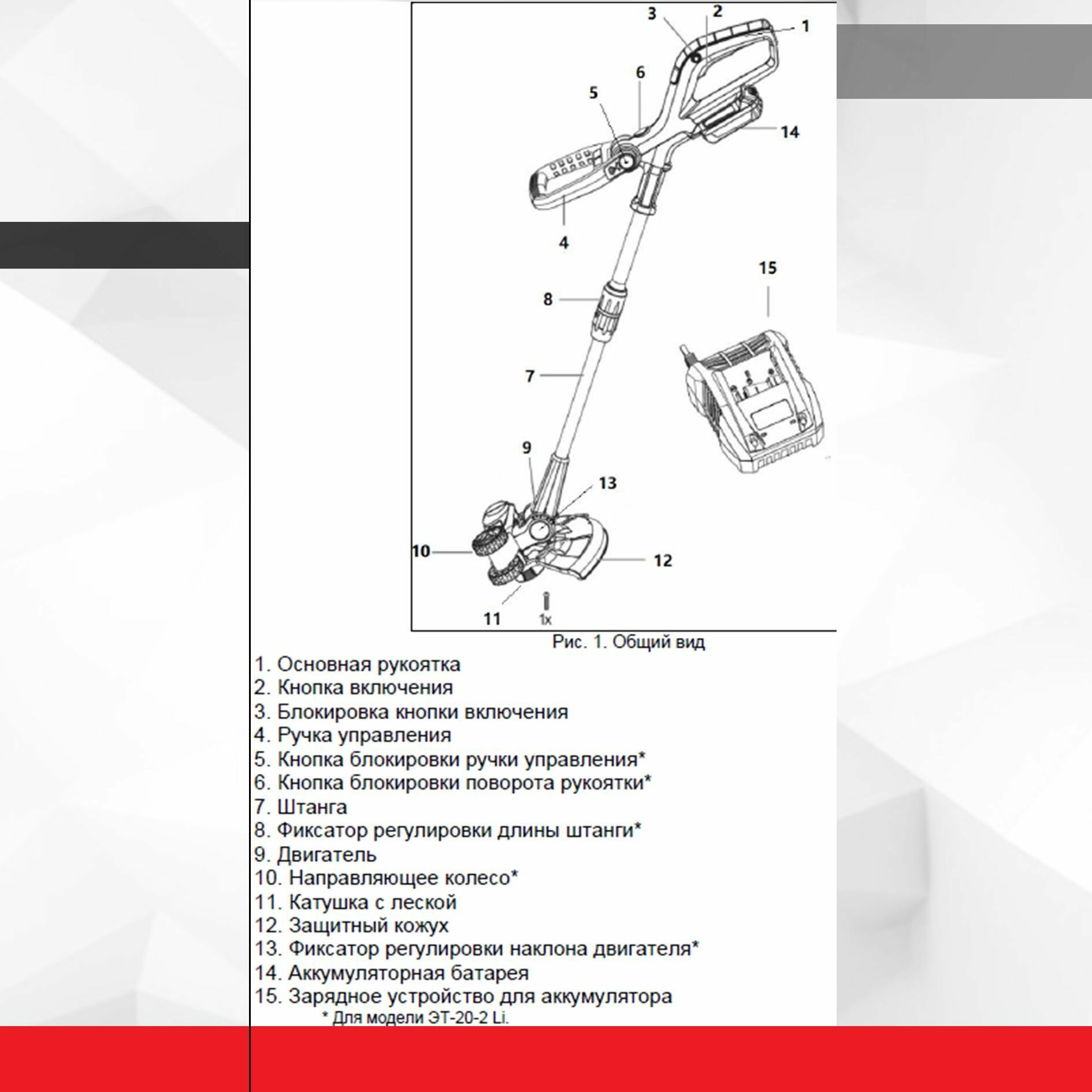 | Подробная комплектация | Триммер в сборе - 1 шт. Аккумулятор – 1 шт. Зарядное устройство – 1шт. Защитный кожух – 1 шт. Крепежный комплект - 1 шт. Рукоятка - 1 шт. Руководство по эксплуатации - 1 экз. |