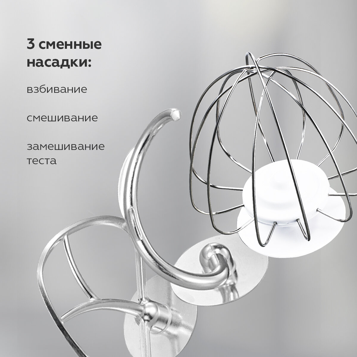 | Насадки | венчик для взбивания / для приготовления фарша / крючки для замешивания теста / лопатка / насадка-блендер |