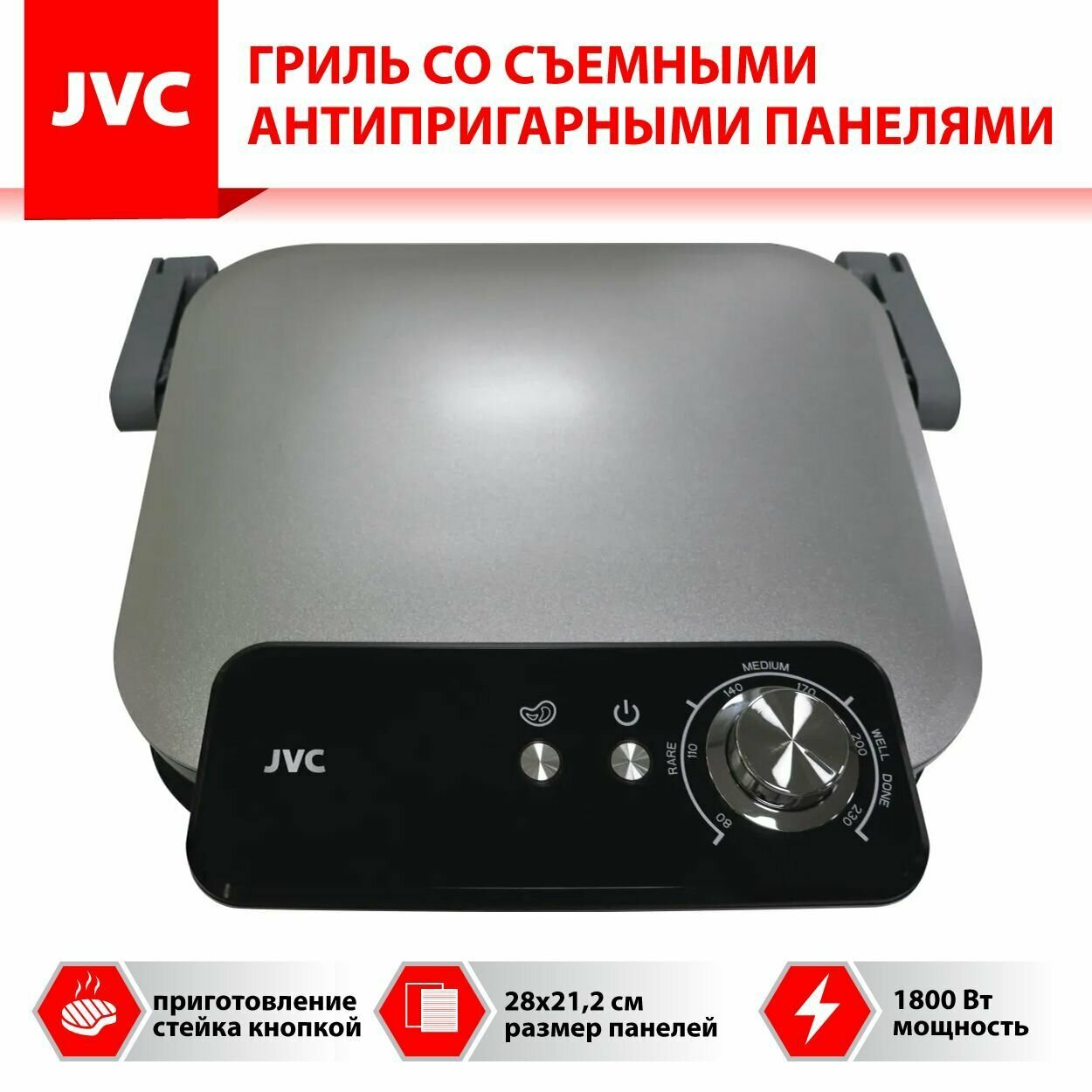 Гриль электрический JVC со съемными антипригарными панелями 28х21,2 см, функция приготовления стейка, автоопределение толщины, 3 степени прожарки, 1800 Вт