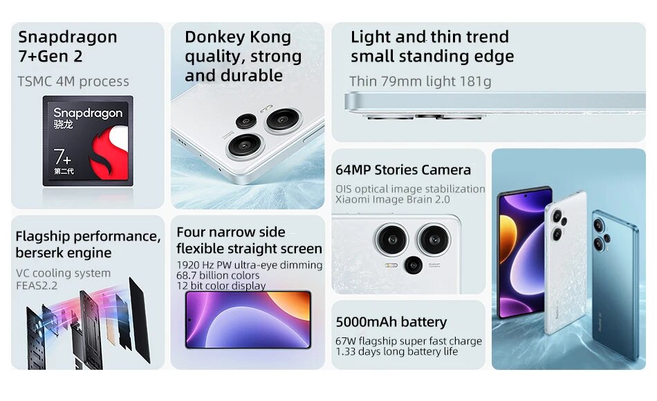 Глобальная прошивкой Xiaomi Redmi Note 12 Turbo 5G 256 ГБ /512 ГБ / 1 ТБ Snapdragon 7+ Gen 2 120Гц OLED дисплей NFC 67Вт Быстрая зарядка 64Мп Камера