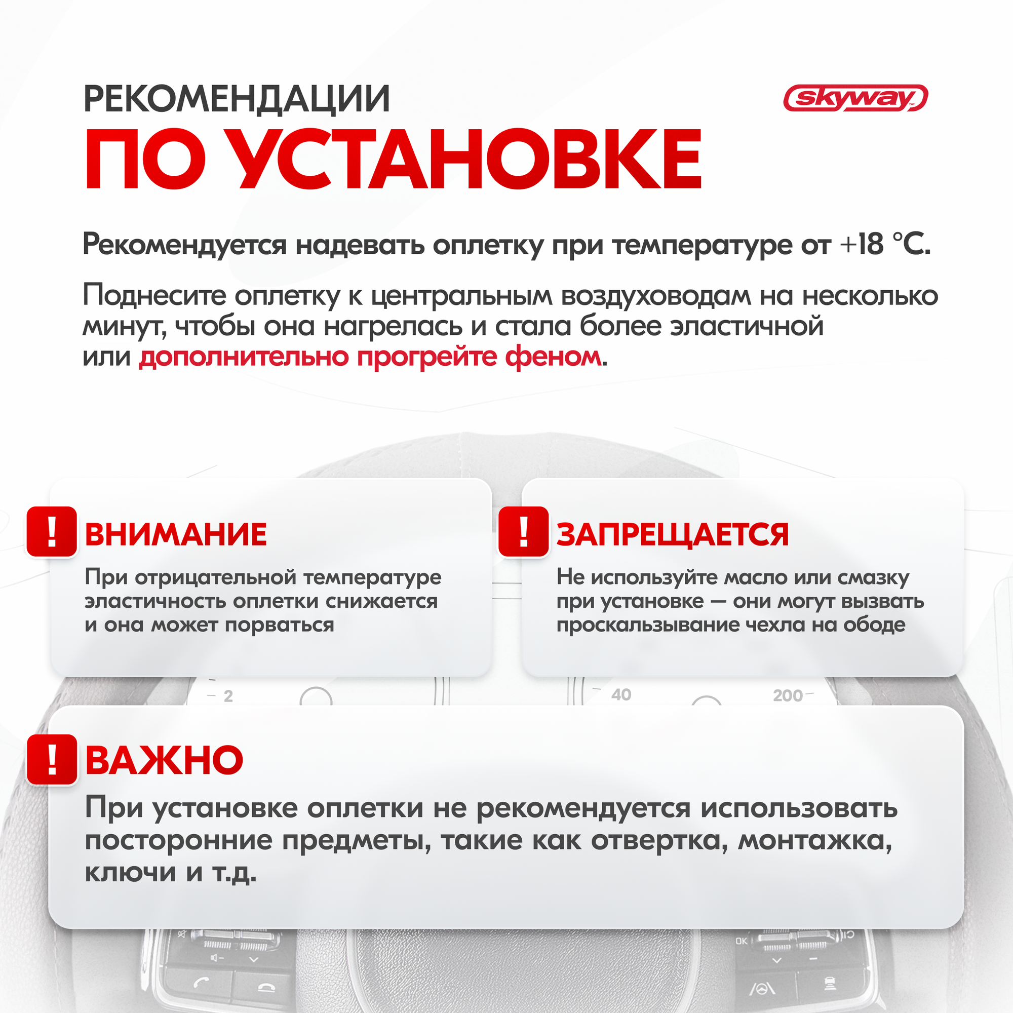 | Дополнительная информация | Рекомендации производителей: выбирайте оплетку под размер вашего рулевого колеса. Неверно выбранный размер может стать причиной проскальзывания оплётки или привести к невозможности снять или надеть её на руль. |