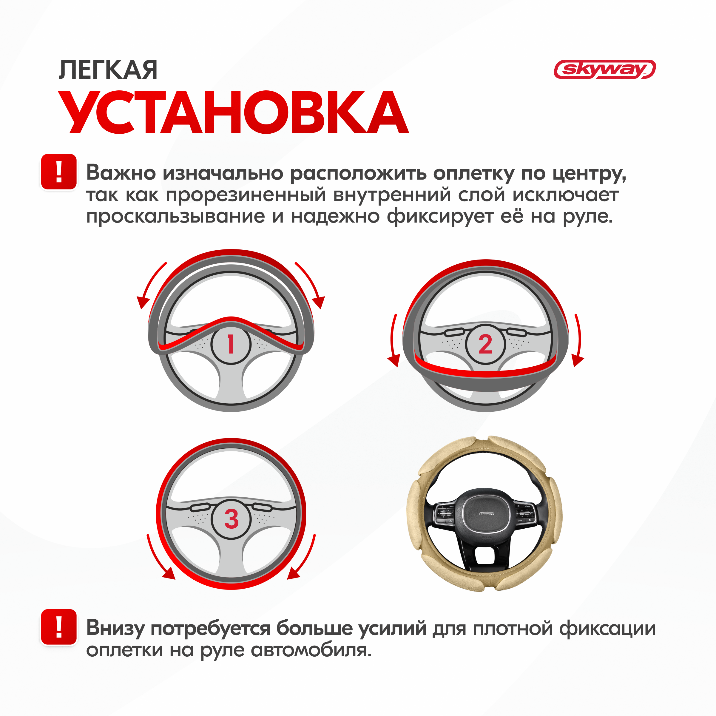 | Дополнительная информация | Рекомендации производителей: выбирайте оплётку под размер вашего рулевого колеса. Неверно выбранный размер может стать причиной проскальзывания оплётки, привести к невозможности снять или надеть её на руль. |