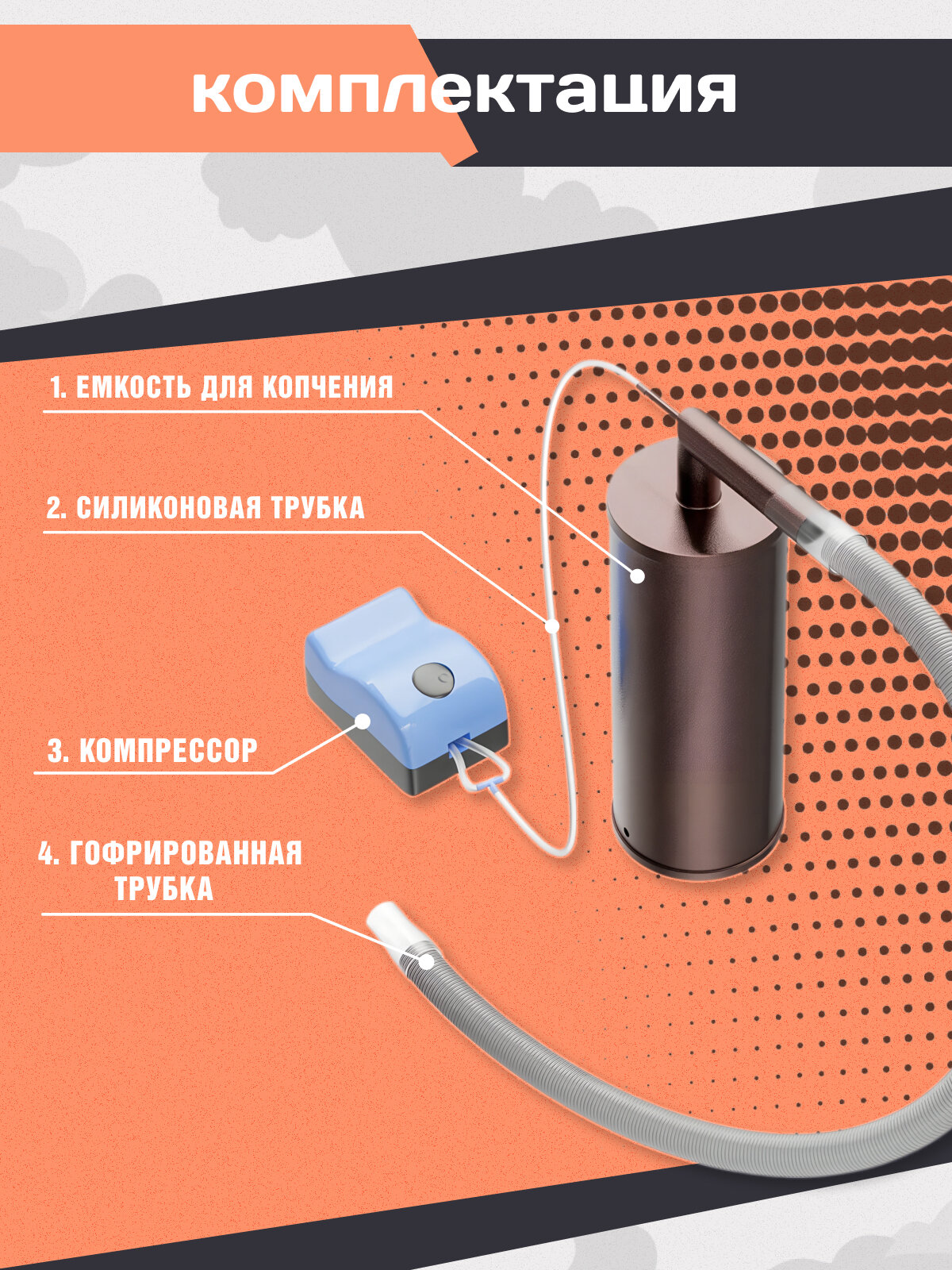 | Дополнительная информация | Дымогенератор - 1 шт, компрессор - 1 шт., , гофрированный шланг - 1 шт., силиконовый шланг - 1 шт., руководство по эксплуатации - 1 шт |