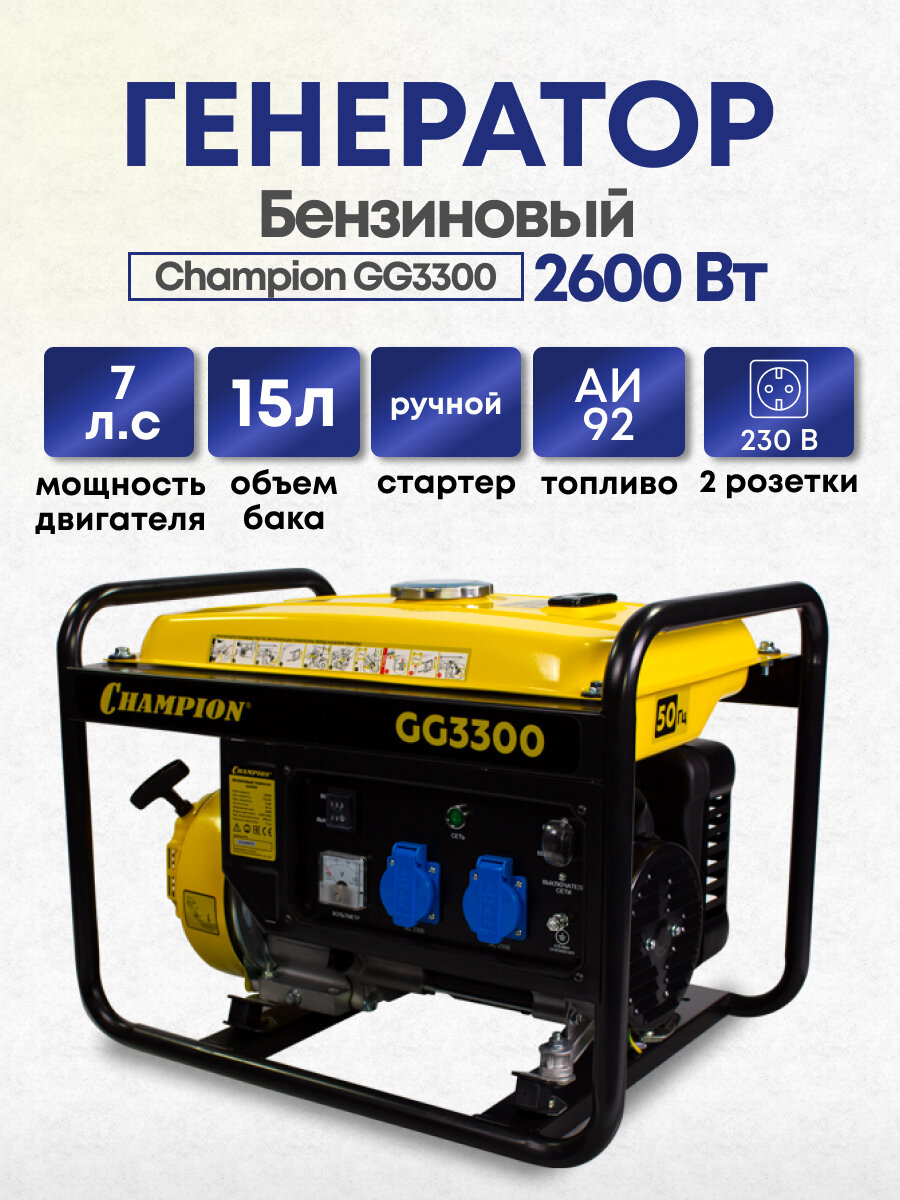 Генератор CHAMPION GG3300 (2,6/3кВт 7лс 15л 41,5кг) CHAMPION