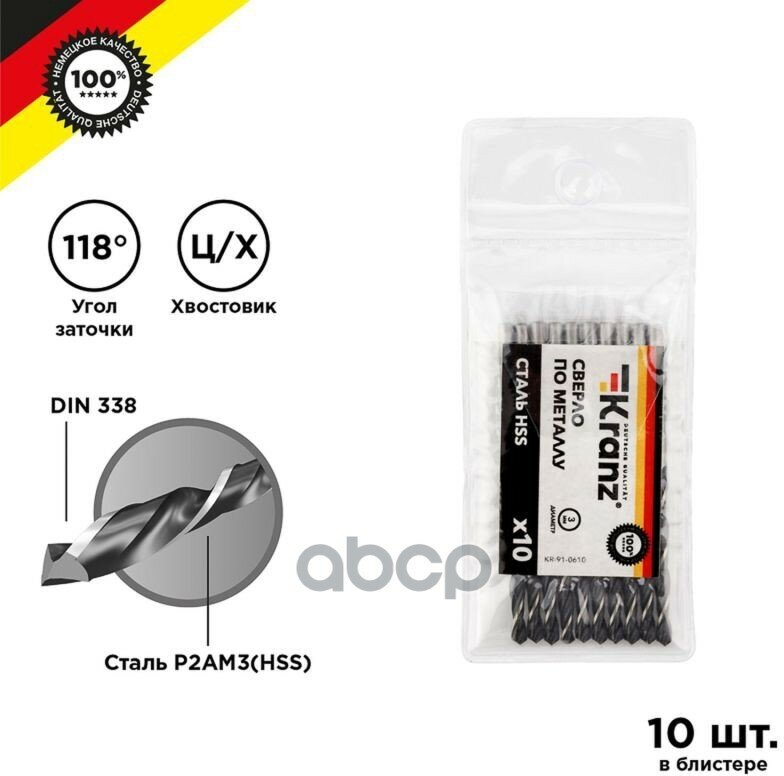 Сверло по металлу 3,0 мм HSS (10 шт. в упаковке) DIN 338 Kranz Kranz KR910610, KR910610 KRANZ KR-91-0610