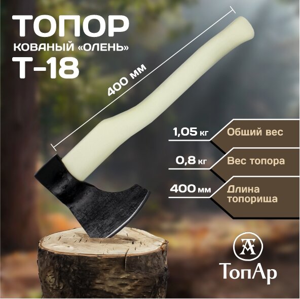 Топор кованый "Олень" с деревянным клином ТопАр 0,8 кг ручной сборки/Деревянное топорище 400 мм из березы с биозащитным составом