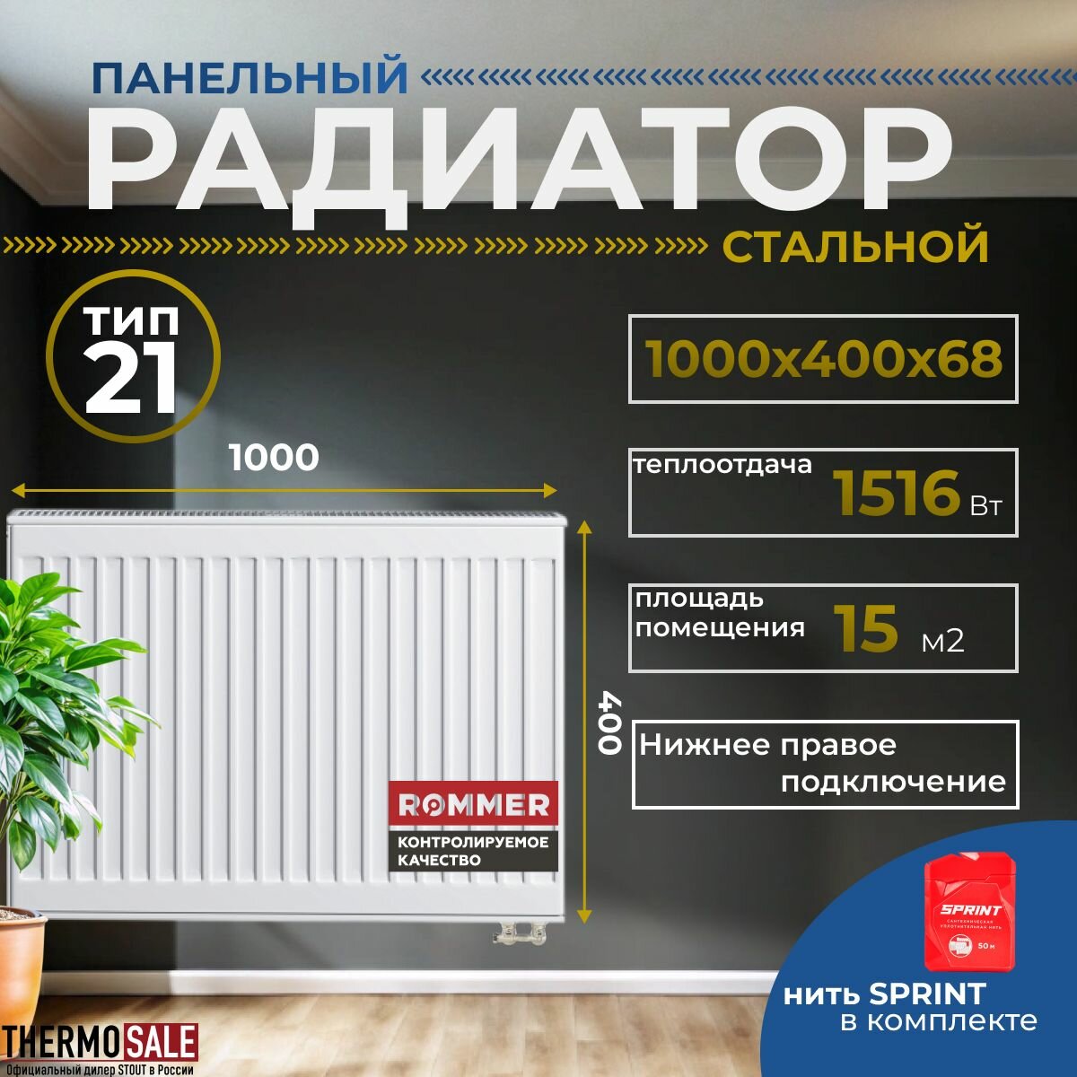 Радиатор стальной панельный ROMMER 400х700 нижнее правое подключение Ventil 21/400/700 Нить сантехническая