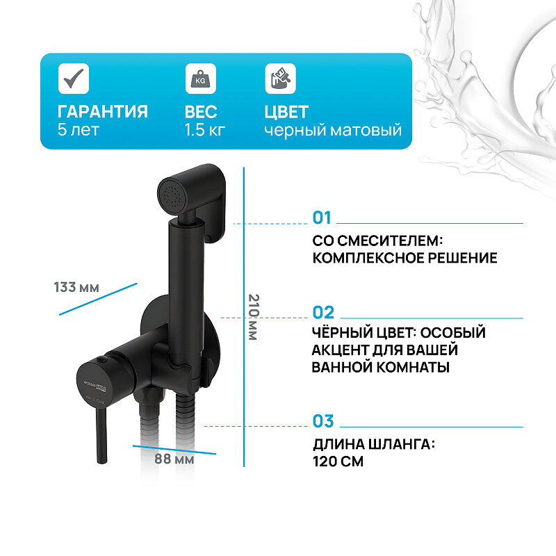 | Комплектация | лейка / гигиеническая лейка / металлический шланг 1200 мм / набор для монтажа |