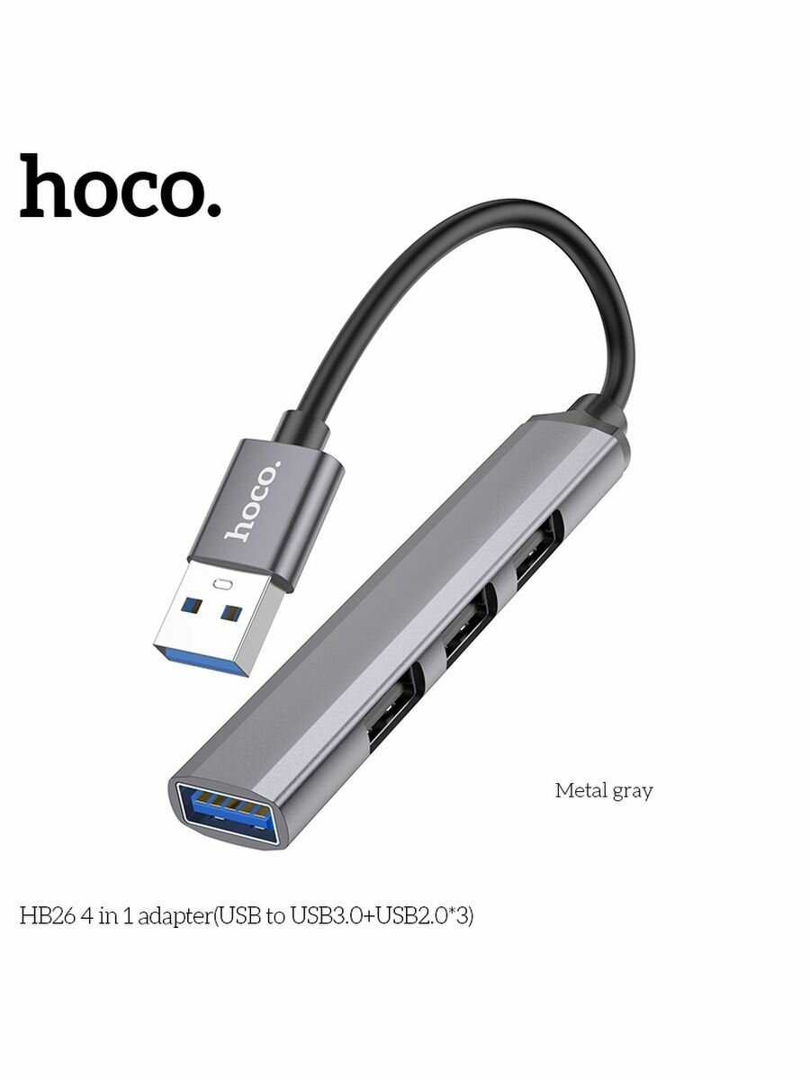 Адаптер Hoco Hb26, 4 в 1, USB - Usb3.0/usb2.0*3, длина кабеля 13 см, серебристый Hoco 9881634