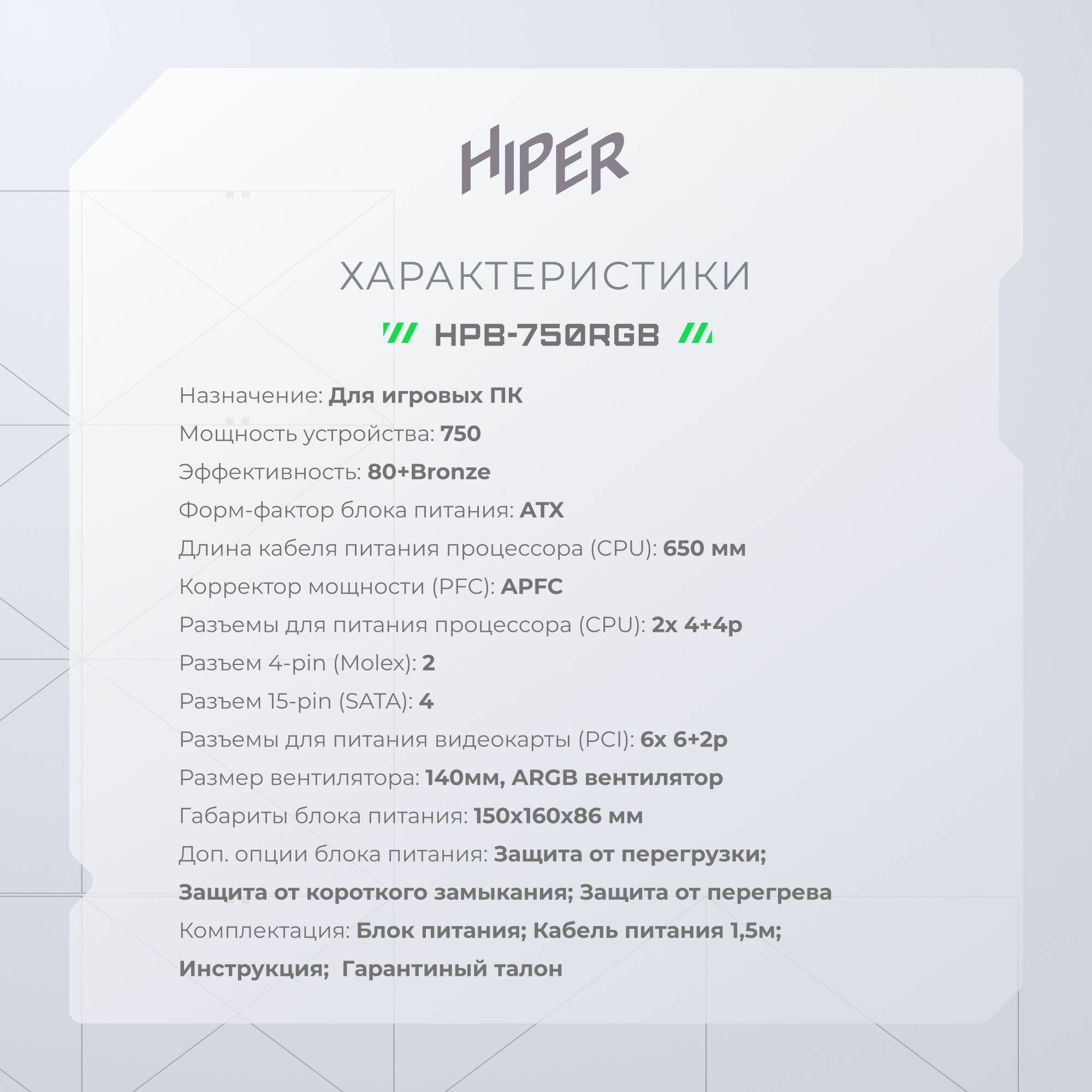 Купить Блок питания HIPER HPB-750RGB, 750Вт, ATX, активный PFC, защита от перегрузки, перенапряжения, короткого замыкания, черный