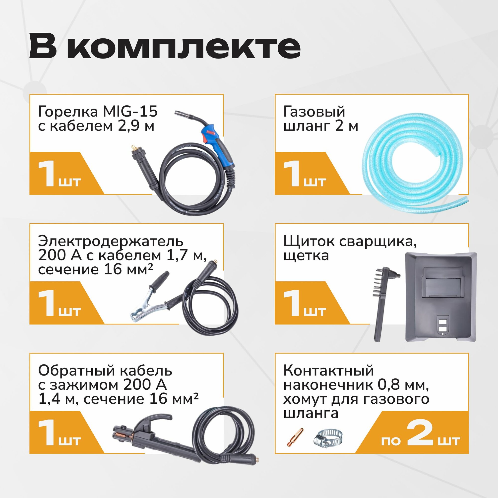 | Комплектация | ➡️ Горелка MIG-15 с кабелем 2,9м - 1шт.; ➡️ Электрододержатель 200А с кабелем 1,7м, сечение 16мм2 - 1шт.; ➡️ Обратный кабель с зажимом 200А 1,4м, сечение 16мм2 - 1шт.; ➡️ Газовый шланг 2м - 1шт.; ➡️ Контактный наконечник 0,8мм - 2шт.; ➡️ Щиток сварщика, щетка - 1 компл.; ➡️ Хомут для газового шланга - 2шт.; ➡️ Руководство по эксплуатации - 1шт.; ➡️ Гарантийный талон - 1шт. ⚠️⚠️⚠️ Для проведения аргонодуговой сварки необходима горелка с вентилем, (приобретается отдельно). |