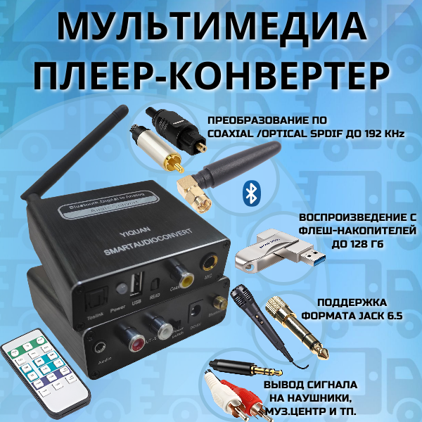 Мультимедиа плеер конвертер ЦАП Bluetooth 5.0 USB Optical Toslink Coaxial на 3.5 jack RCA тюльпаны Караоке Микрофон с пультом управления громкостью