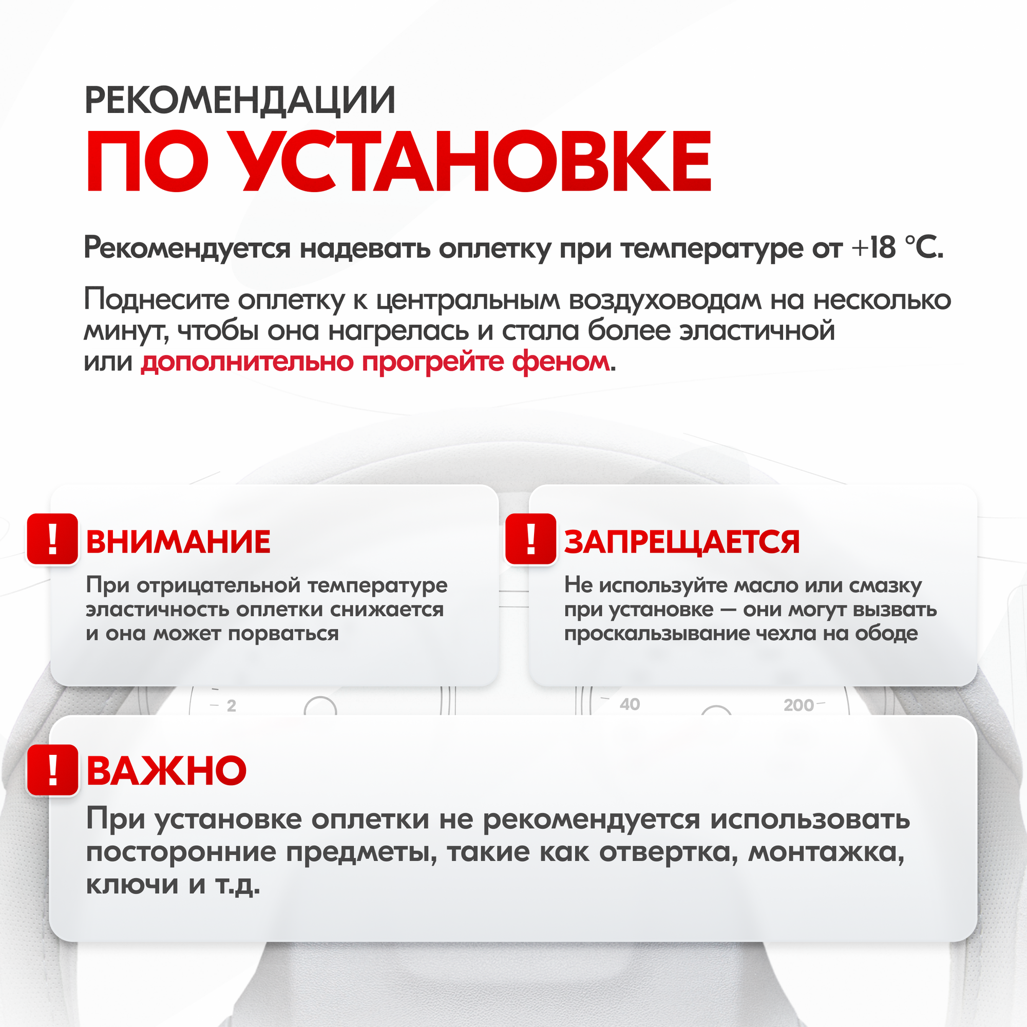 | Дополнительная информация | Рекомендации производителей: выбирайте оплётку под размер вашего рулевого колеса. Неверно выбранный размер может стать причиной проскальзывания оплётки или привести к невозможности снять или надеть её на руль. |