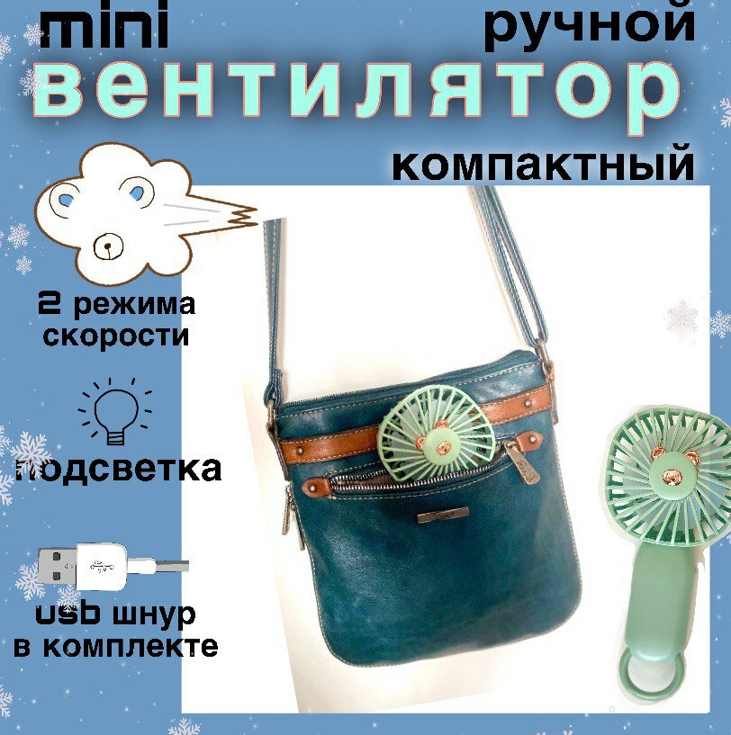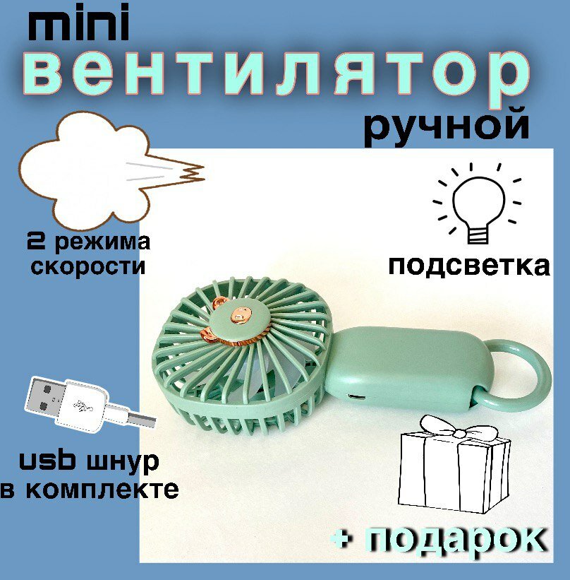 вентилятор ручной мини маленький портативный юсб usb, на аккумуляторе с фонариком, мощный зеленый