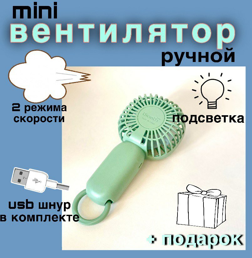 Вентилятор ручной мини маленький беспроводной настольный юсб usb, на аккумуляторе с фонариком, мощный, зеленый