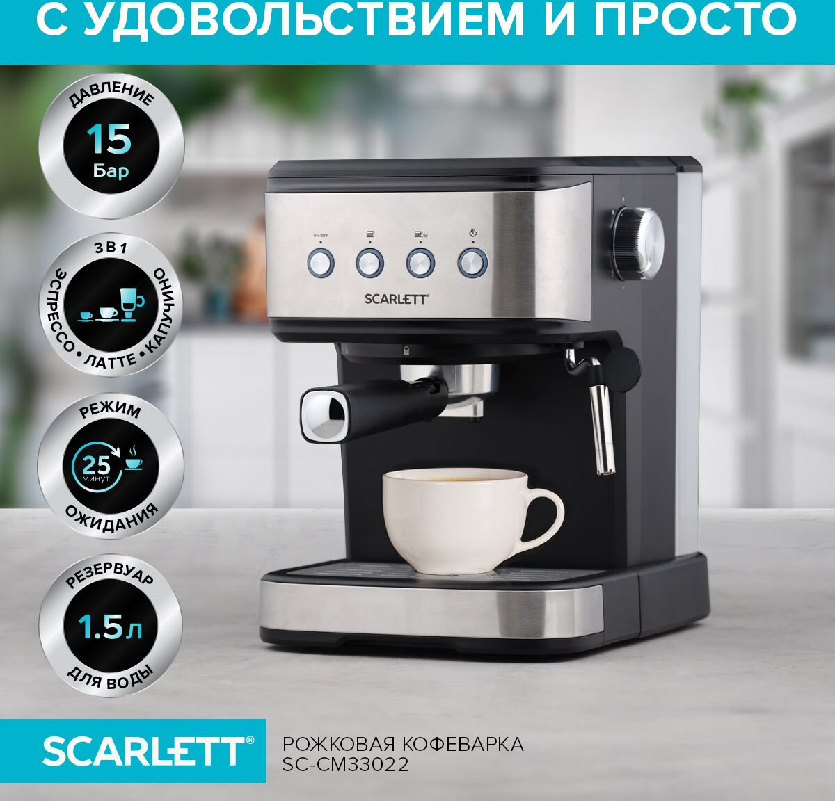 Кофеварка рожковая SCARLETT SC-CM33022 эспрессо, латте, капучино, резервуар для воды 1.5 л
