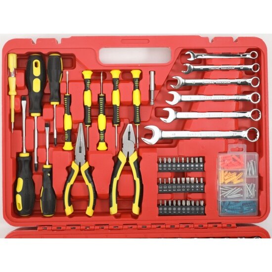 | Аксессуары в комплекте | держатель для бит / дюбели / лезвия для ножа / набор крепежа / нож / уровень / длиногубцы / ключи комбинированные / молоток / плоскогубцы |
