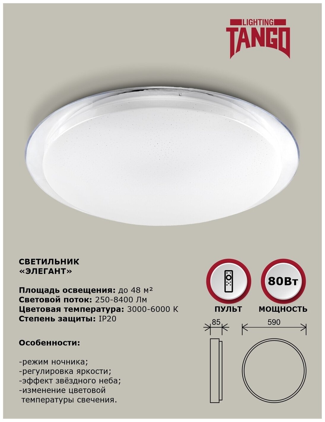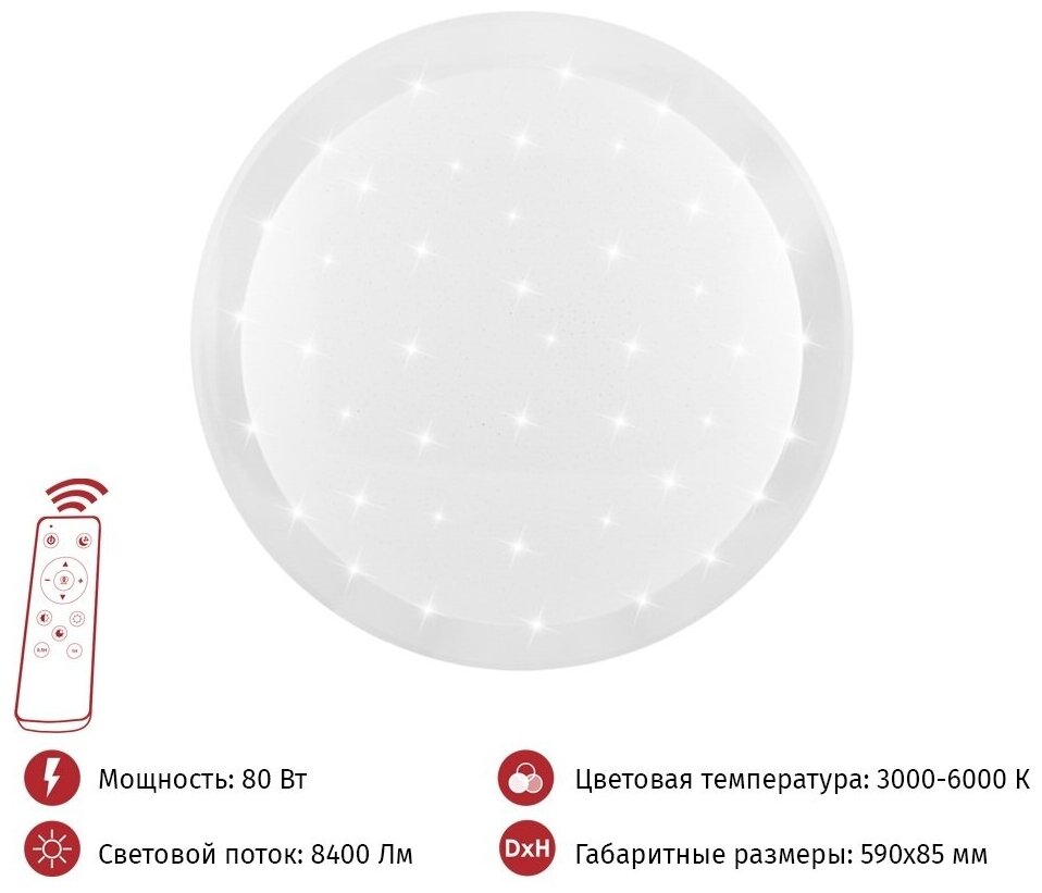 | Дополнительная информация | Смена цветовой температуры с теплого (3000К), на дневной (4000К) или холодный свет (6000К). Управление с помощью пульта ДУ. Режим ночника. Без пульсаций. Встроенные светодиоды, 30000ч. |