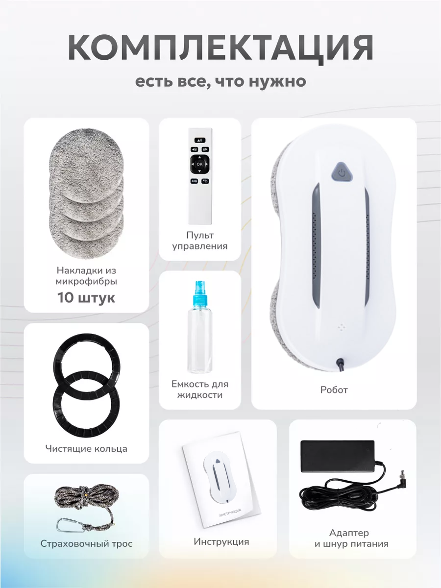 | Комплектация | адаптер питания / моющая тряпка / пульт ДУ / страховочный шнур / робот-мойщик / флакончик / чистящие кольца |