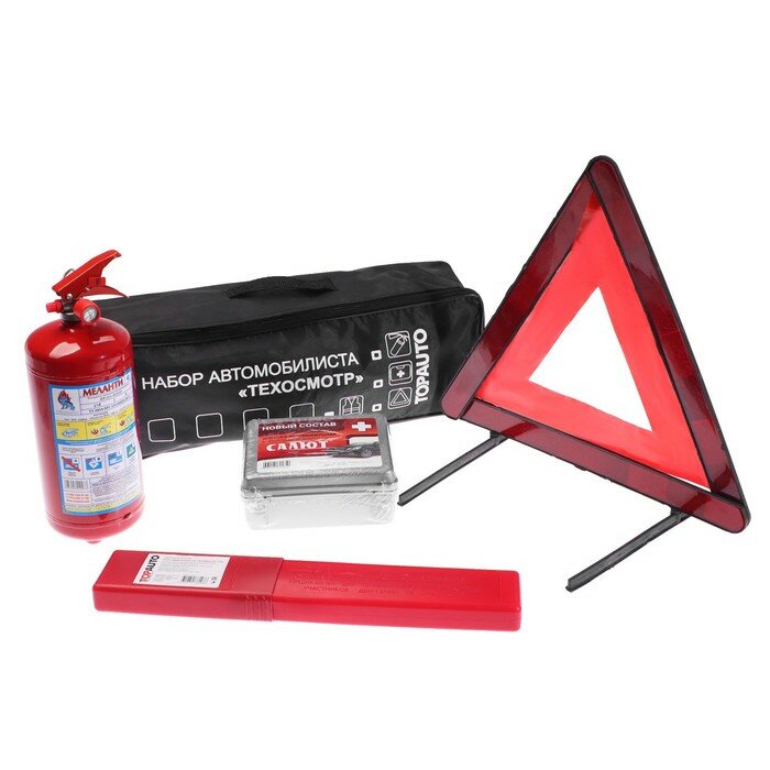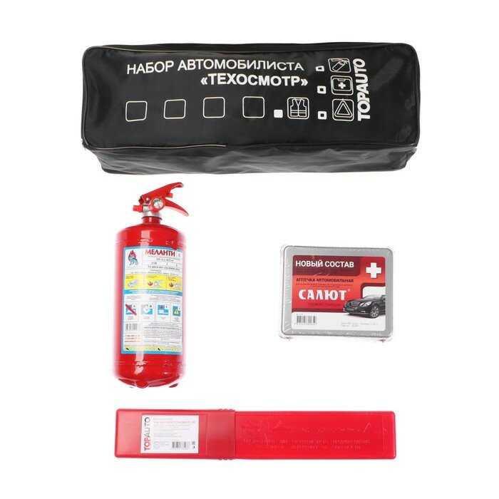 Набор Автомобилиста, TOP AUTO, Техосмотр (Сумка, огнетушитель ОП-2 железный с манометром, Аптечка по приказу, Знак RT-199 EAC), НАТ интересное: