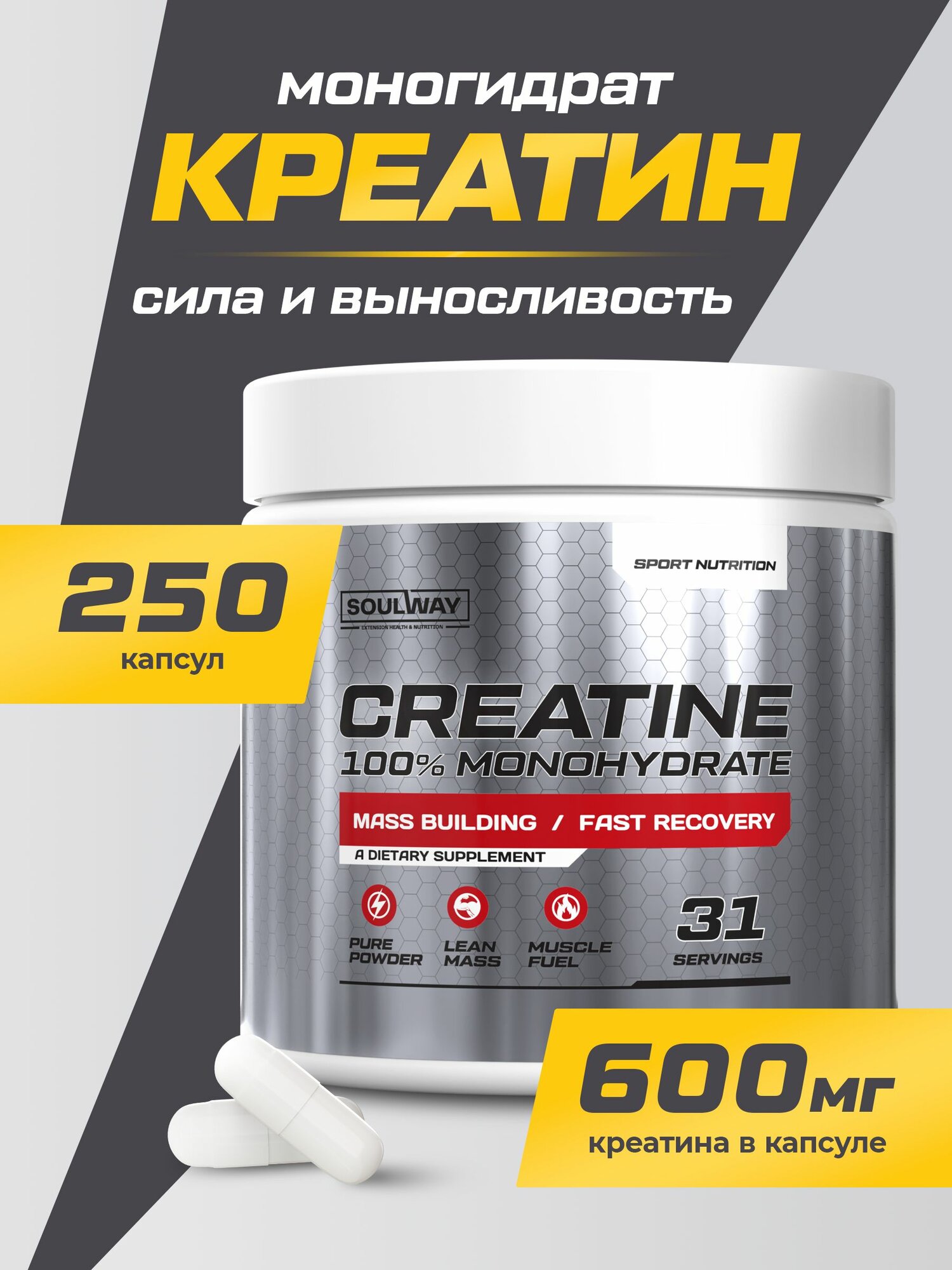 Креатин моногидрат 250 капсул 31 порция, спортивное питание для набора мышечной массы интересное:
