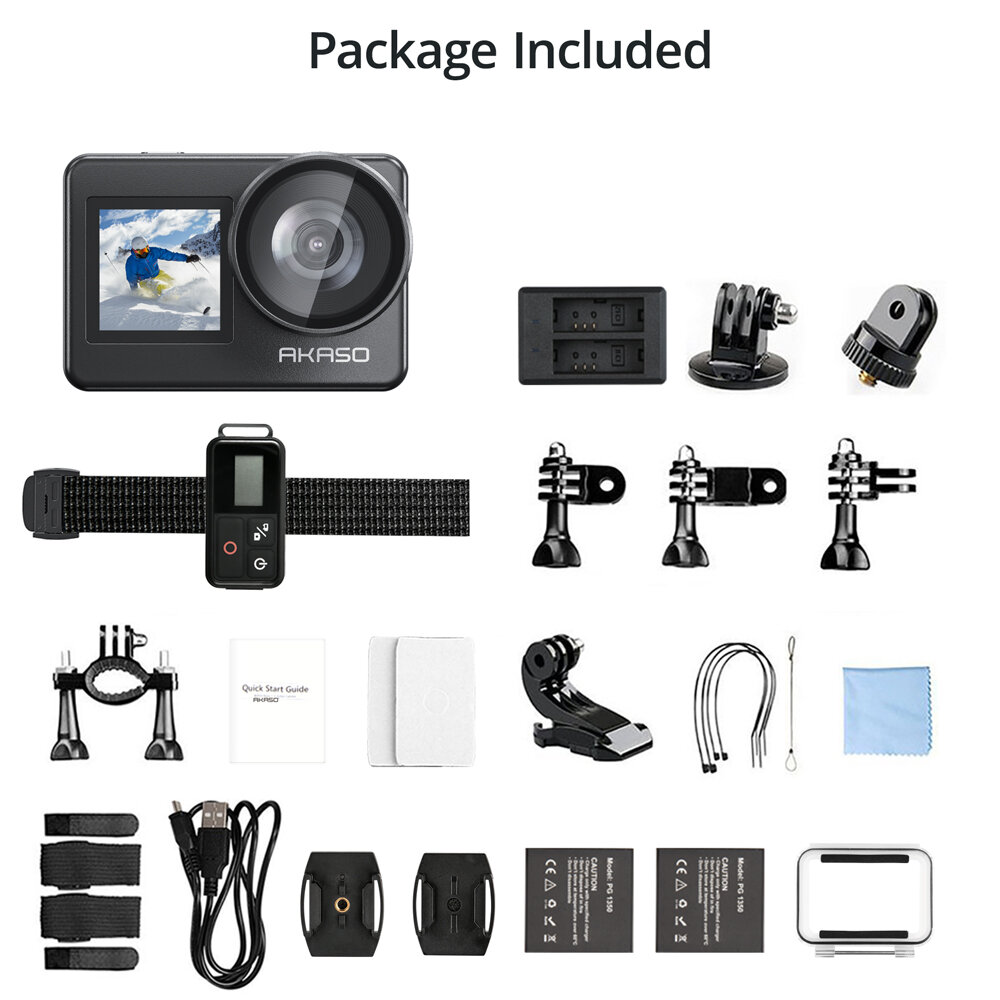 | Комплектация | 1 х экшн-камера AKASO Brave 7, 1 х рамка для камеры, 1 х пульт дистанционного управления, 1 х зарядное устройство, 2x1350 мАч батарея, 7 х крепление, 2 х крепление на шлем, 1 х ткань для объектива, 1 х крепление на руль, 5 х ремешок, 5 х застежка-молния, 1 х USB кабель, 2 х клейкая прокладка, 1 х Краткое руководство пользователя |