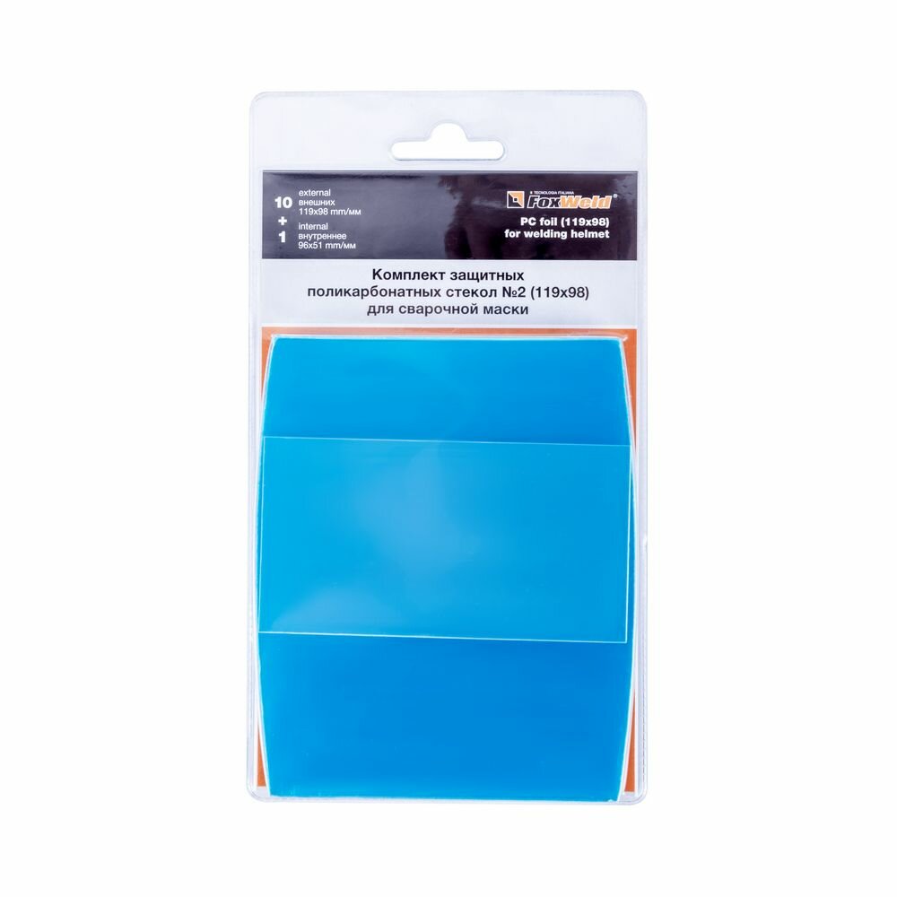 FoxWeld Комплект поликарбонатных стекол для сварочной маски №2 (10 внешних 119х98мм,1 внутреннее 96х51мм, для масок Корунд-2/cварис/Лорд)