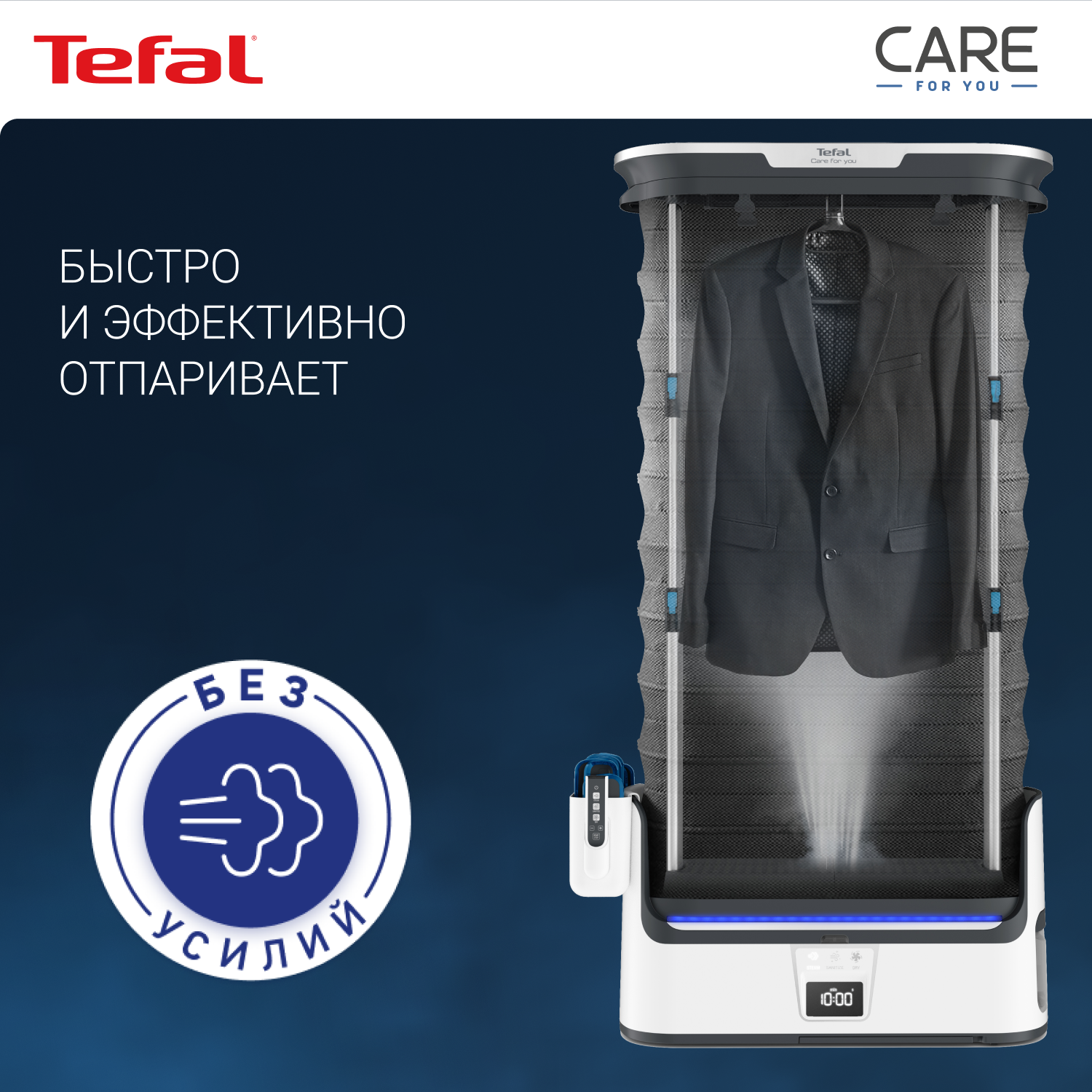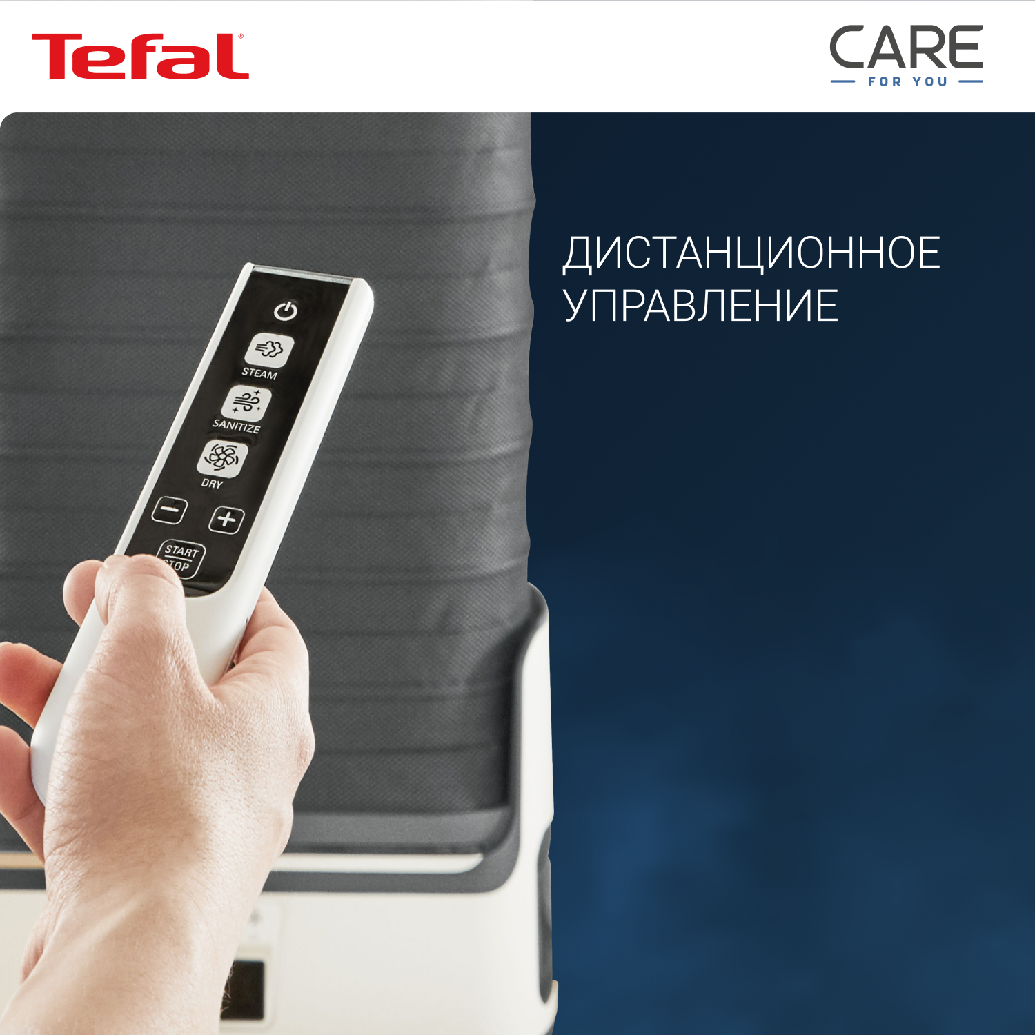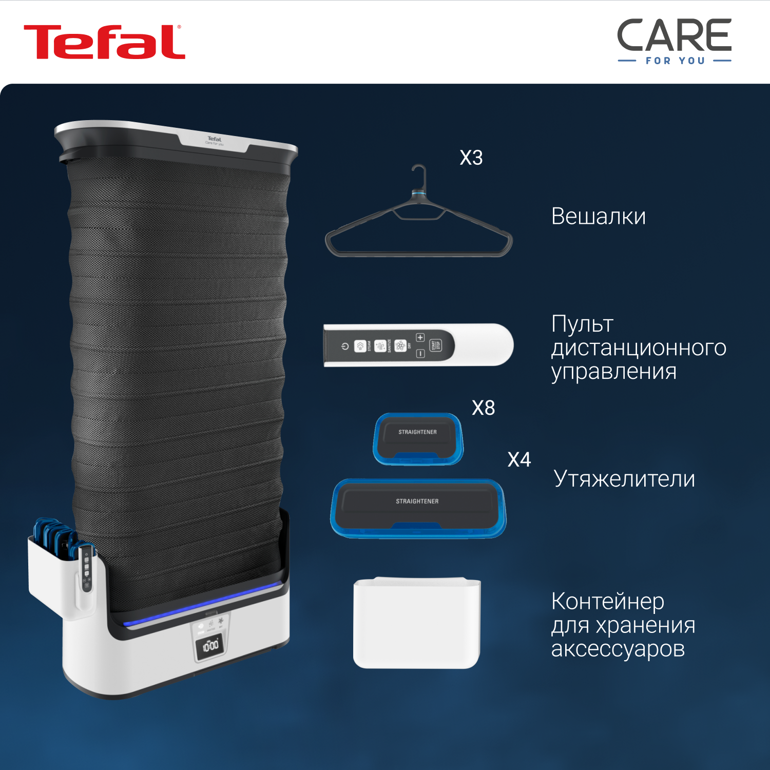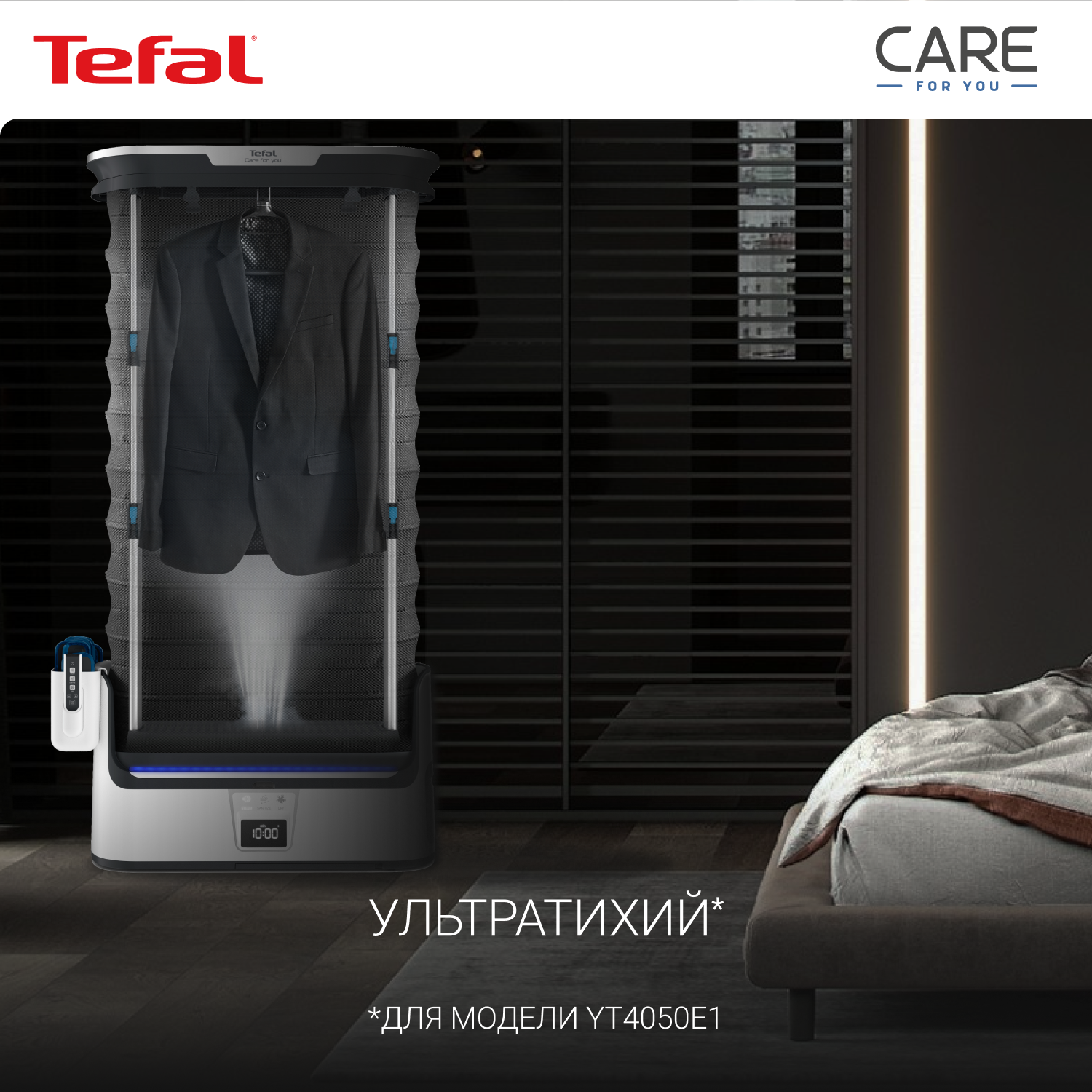 СохранитьПаровая система Tefal Care For You YT4050E1, со складным корпусом, с функцией бережной сушки и дизенфекции, ЖК-экраном, пультом ДУ, 12 утежилителями, 1800 Вт, белая/серая интересное:
