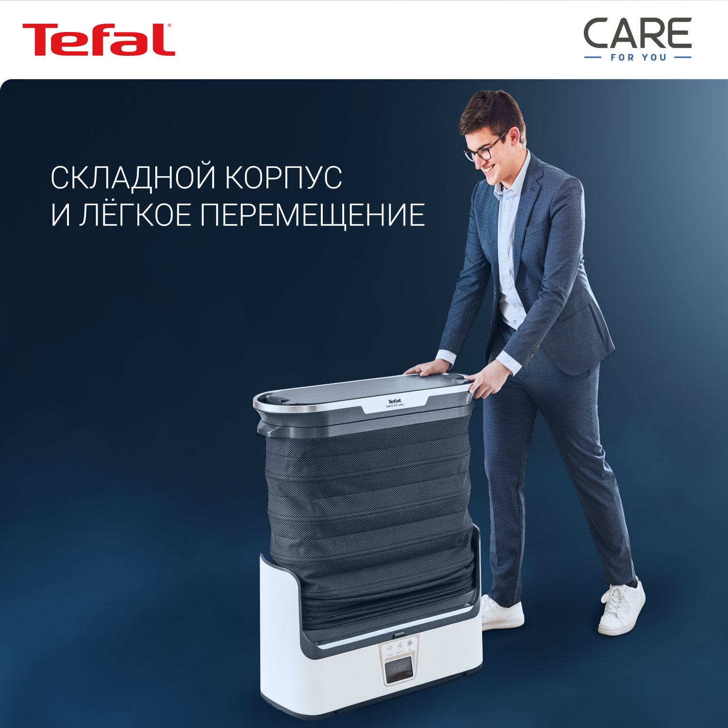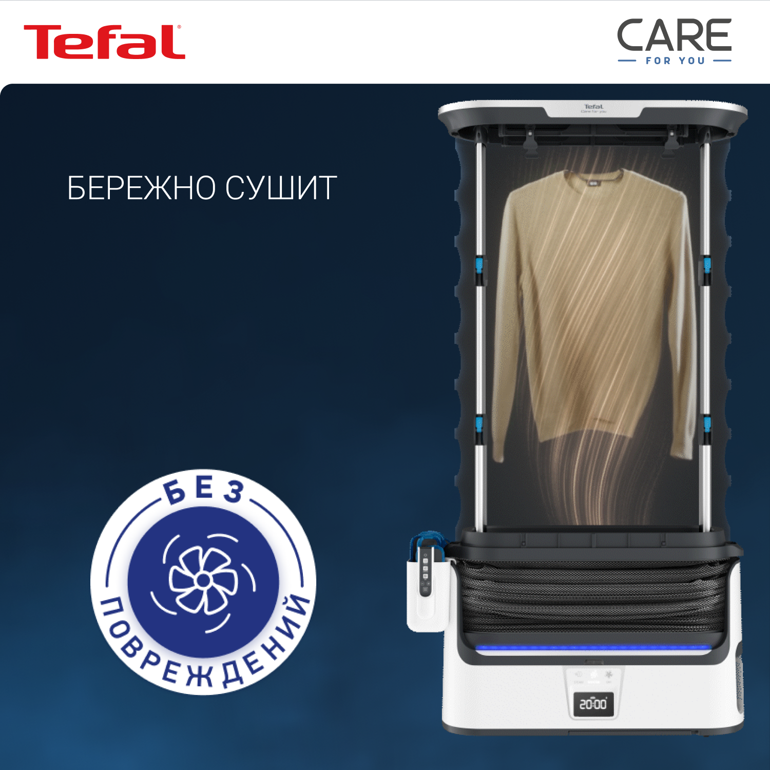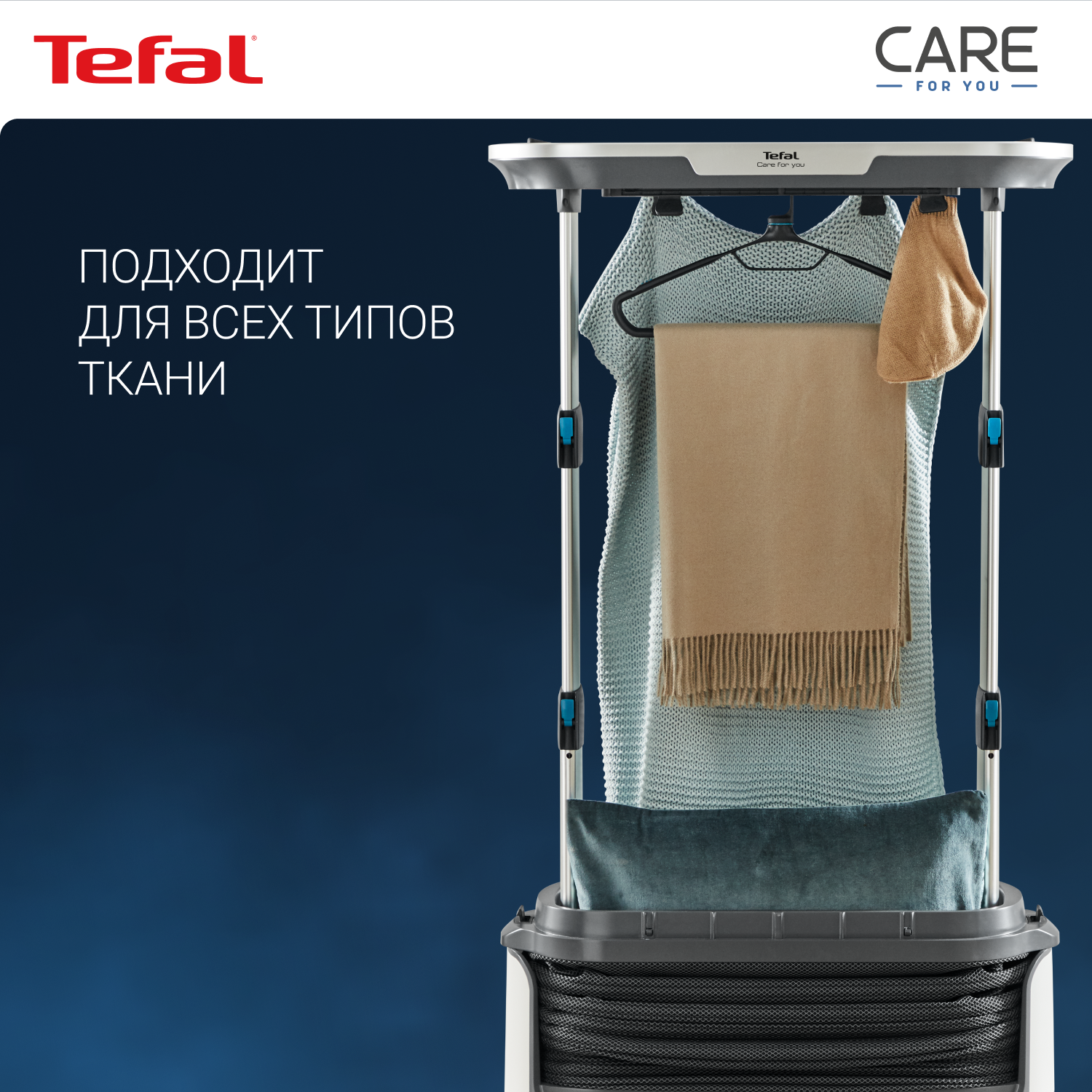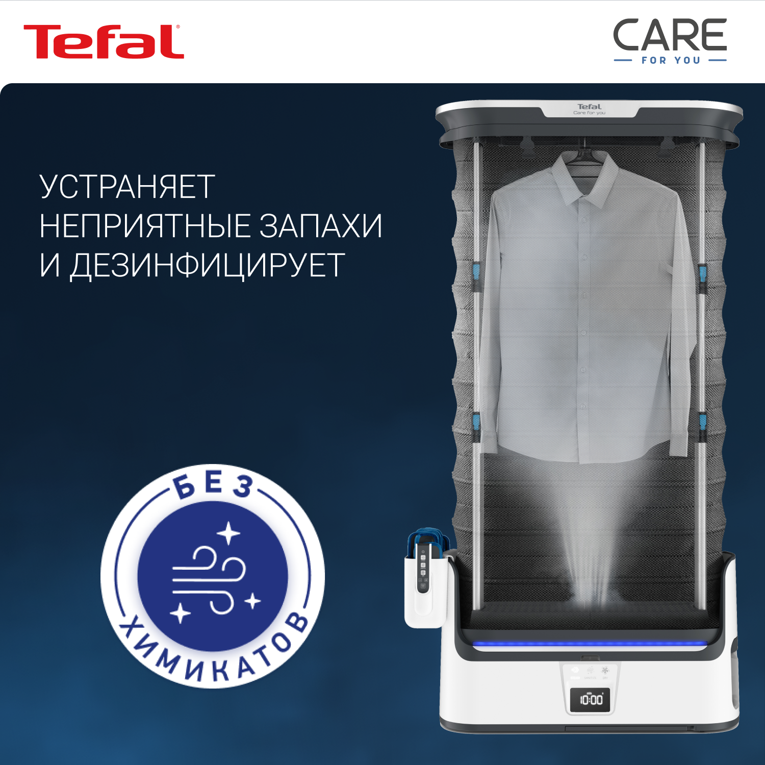 СохранитьПаровая система Tefal Care For You YT4050E1, со складным корпусом, с функцией бережной сушки и дизенфекции, ЖК-экраном, пультом ДУ, 12 утежилителями, 1800 Вт, белая/серая интересное: