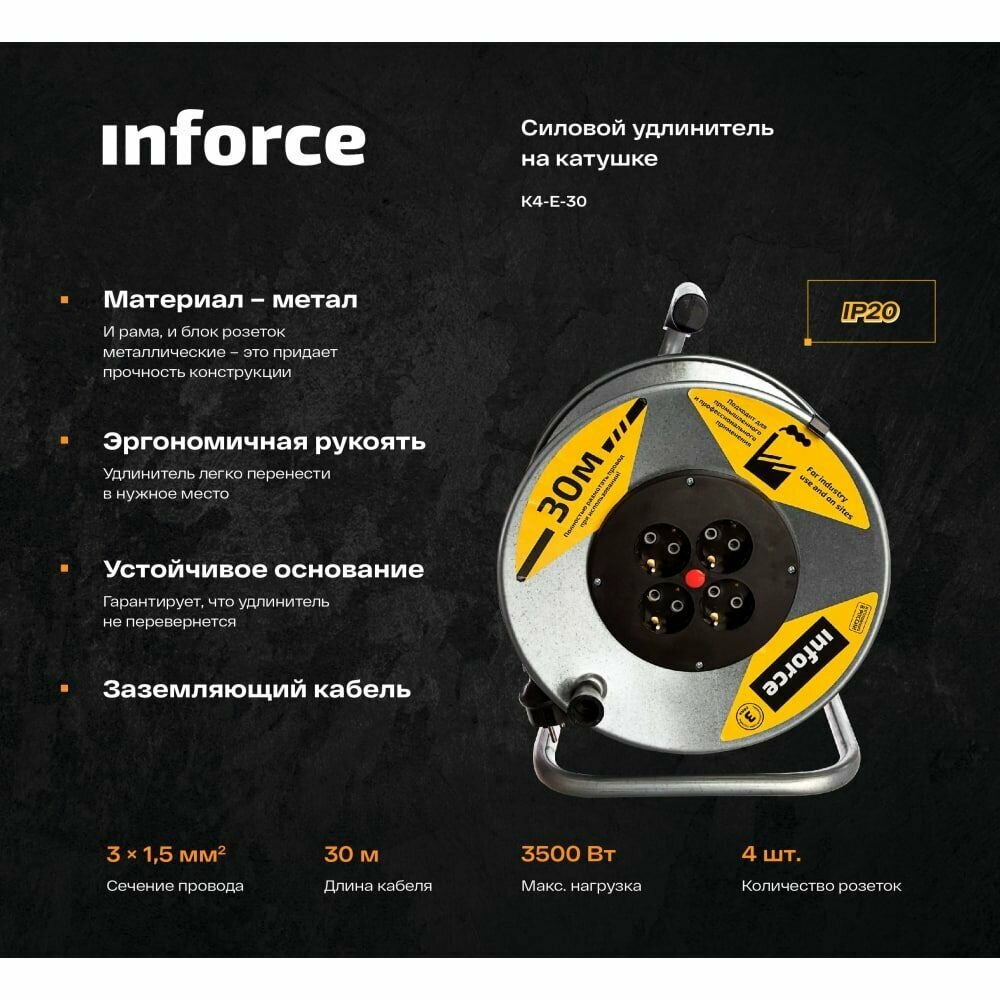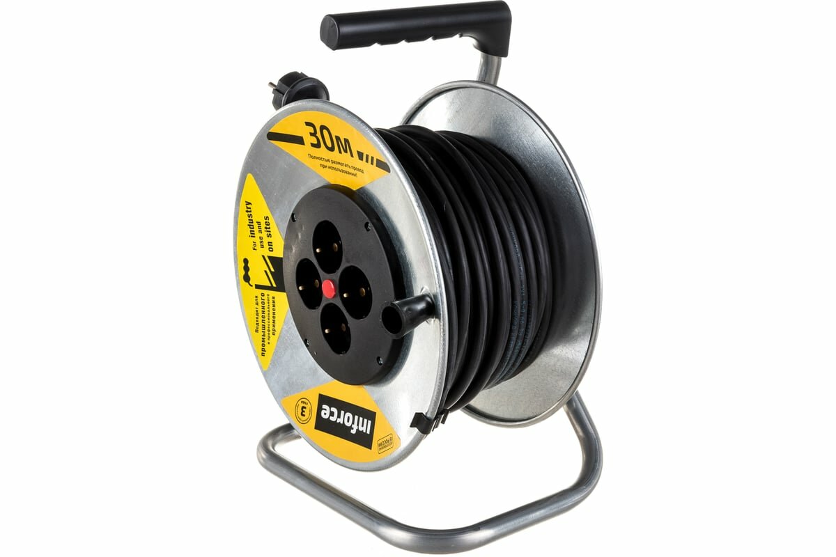 Силовой удлинитель Inforce К4-Е-30 на металлической катушке КГ 3x1.5 30м 16А, 4 розетки с з/к 44130