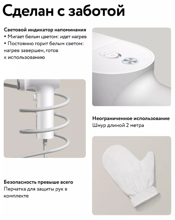 | Плюсы: | Отличная упаковка, отпариватель удобный для пользования, длинный провод, даже защитная варежка в подарок. |