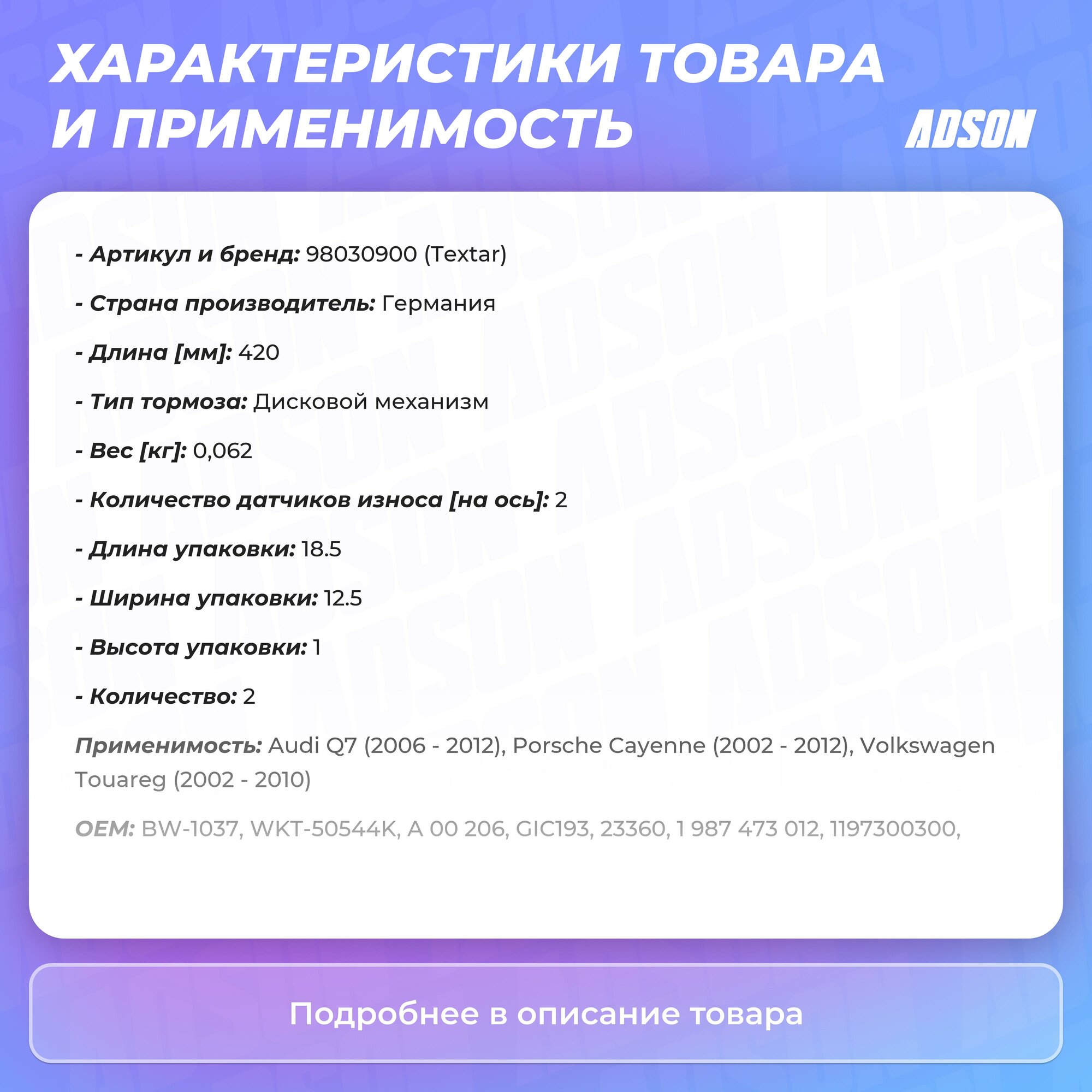 TEXTAR 98030900 (0010101SX / 001040 / 001041) датчик износа пер.колодок VW Touareg (Туарег) 420мм (Комплект 2 штуки)