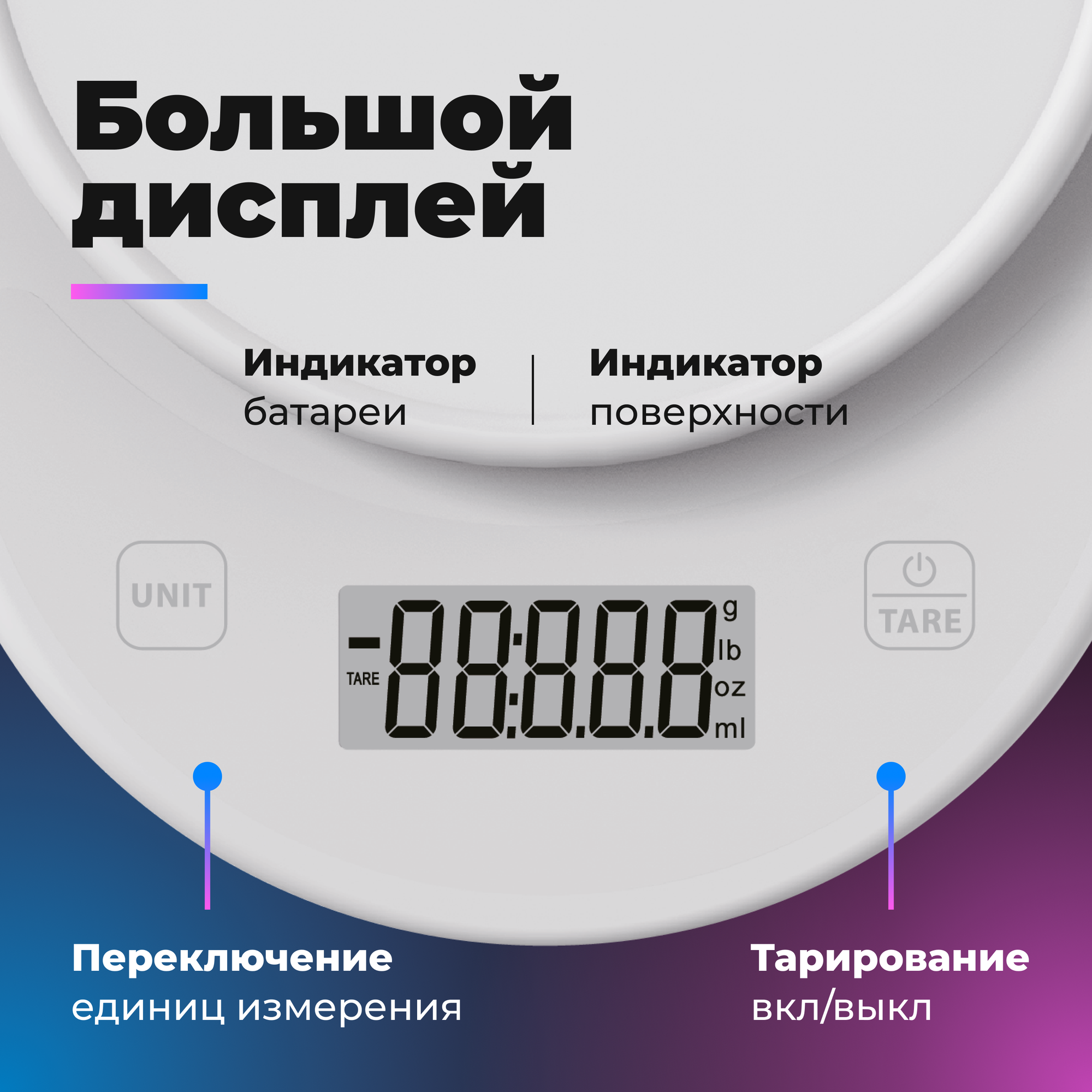 | Дополнительная информация | Заряд от USB; Автоотключение через 2 минуты; Измерение объема жидкости; Индикация перегрузки; Подсветка экрана; Индикация неровной поверхности; Компактная и функциональная форма. |