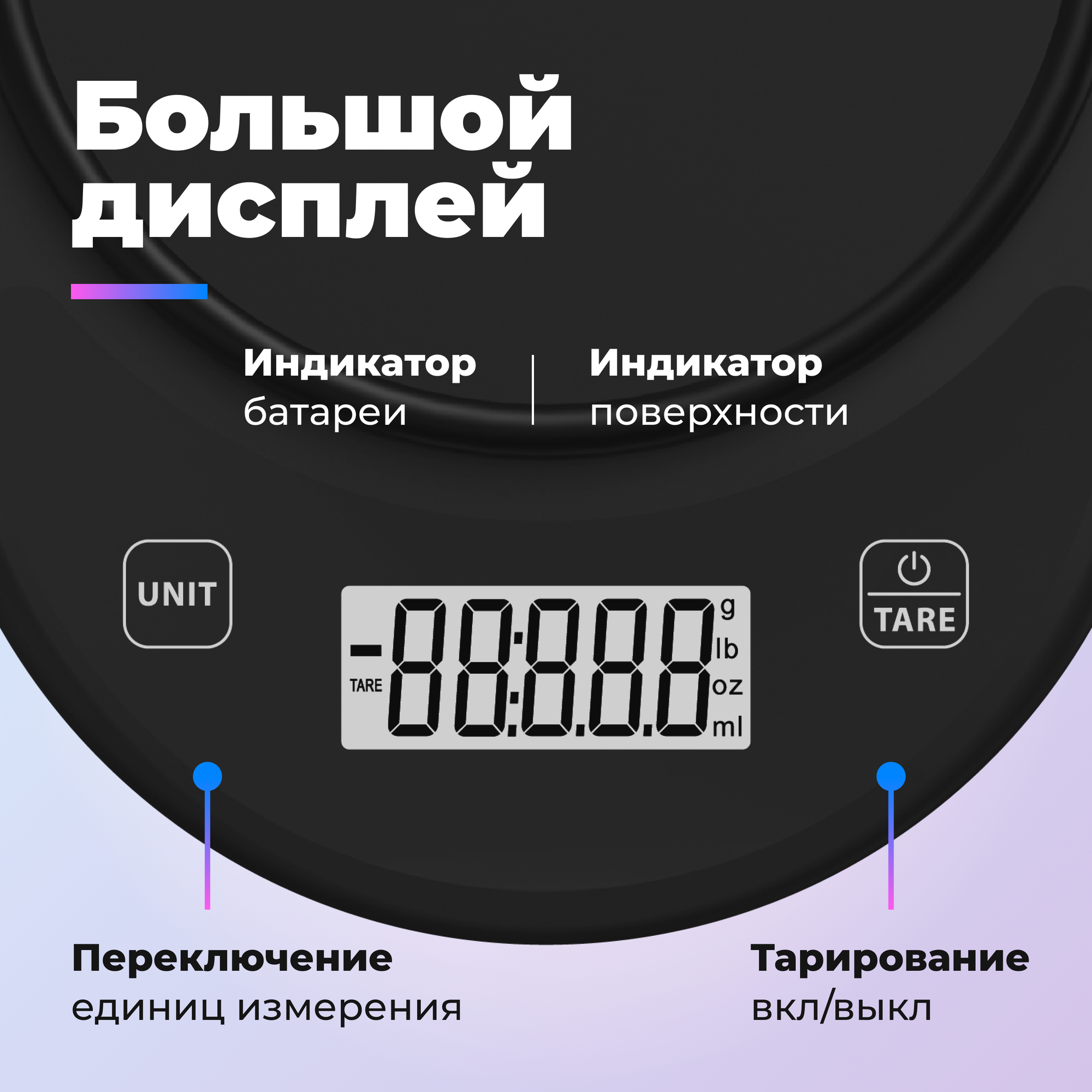 | Дополнительная информация | Заряд от USB; Автоотключение через 2 минуты; Измерение объема жидкости; Индикация перегрузки; Подсветка экрана; Индикация неровной поверхности; Компактная и функциональная форма. |