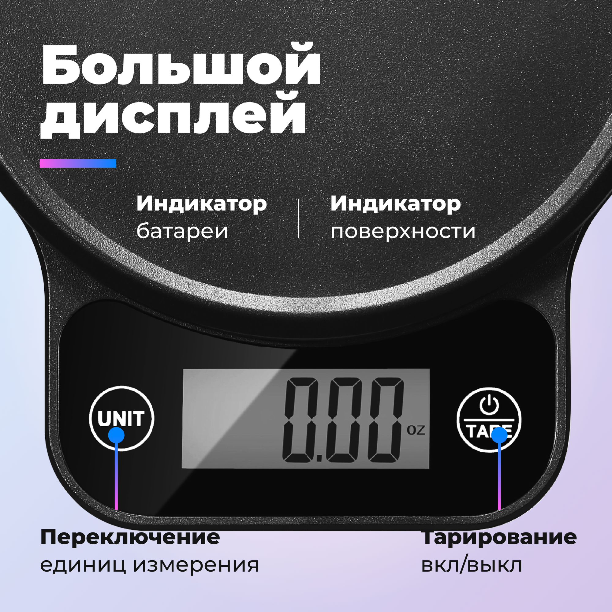 | Дополнительная информация | Заряд от USB; Автоотключение через 2 минуты; Измерение объема жидкости; Индикация перегрузки; Подсветка экрана; Индикация неровной поверхности; Компактная и функциональная форма. |
