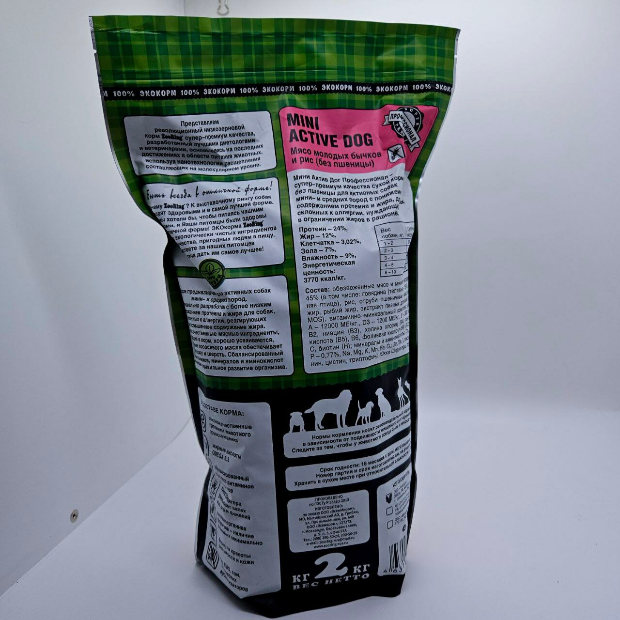 ZooRing Mini Active Dog Сухой корм д/собак Мясо молодых бычков и рис. 24/12, 2 кг