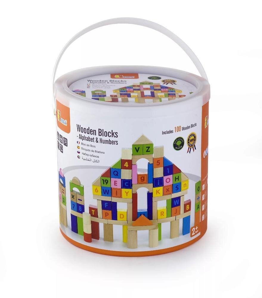Конструктор деревянный 100 деталей (буквы, цифры) в ведре, VIGA 50288