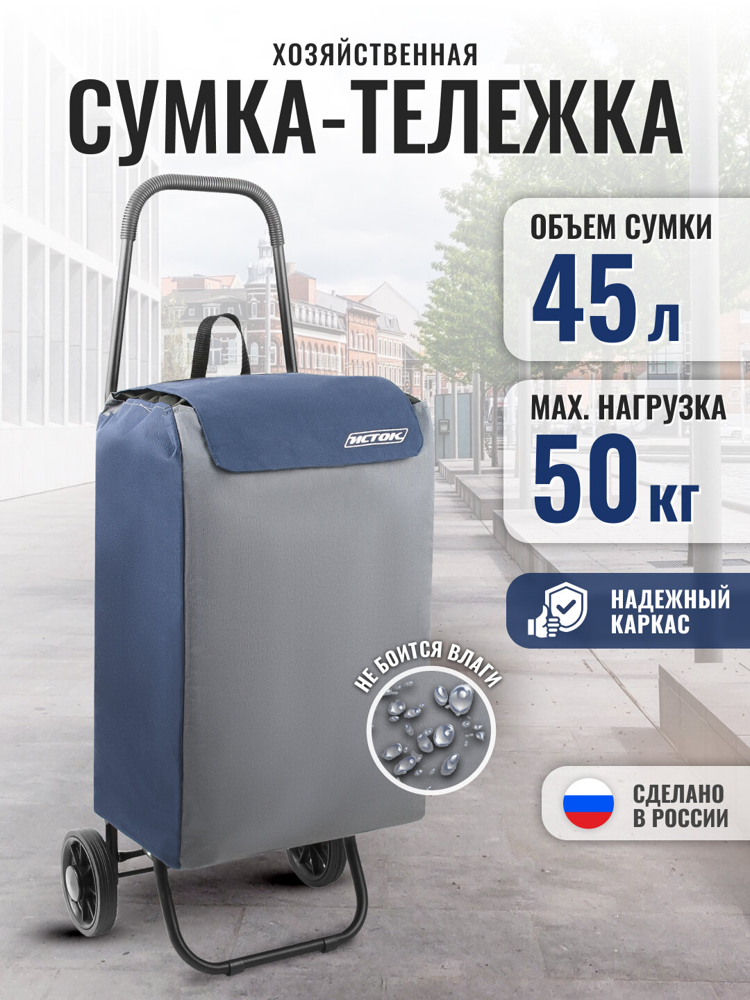 Сумка-тележка исток Спутник 3 Макси СТМ31, боковой и передний карман, синий/серый, 45 кг