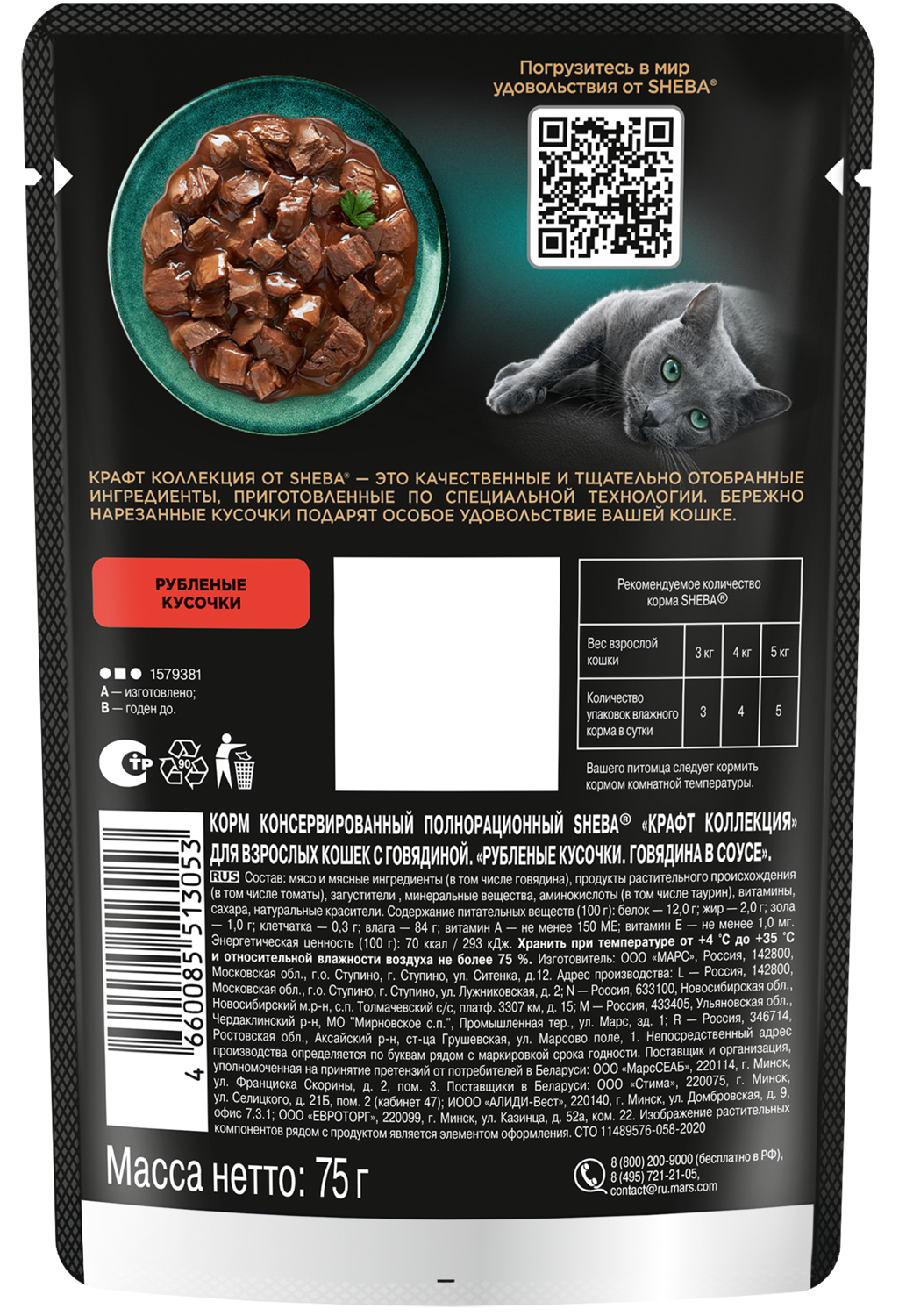 Sheba Влажный корм для кошек (паучи) CRAFT COLLECTION «Рубленые кусочки. Говядина в соусе» 1023150310244558 0,075 кг 51112 (18 шт)
