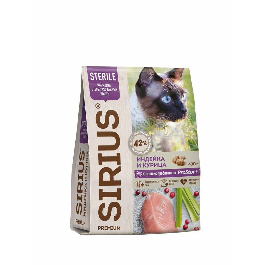 SIRIUS/Полнорационный сухой PREMIUM корм для стерилизованных кошек, Индейка и курица, 0.4 кг