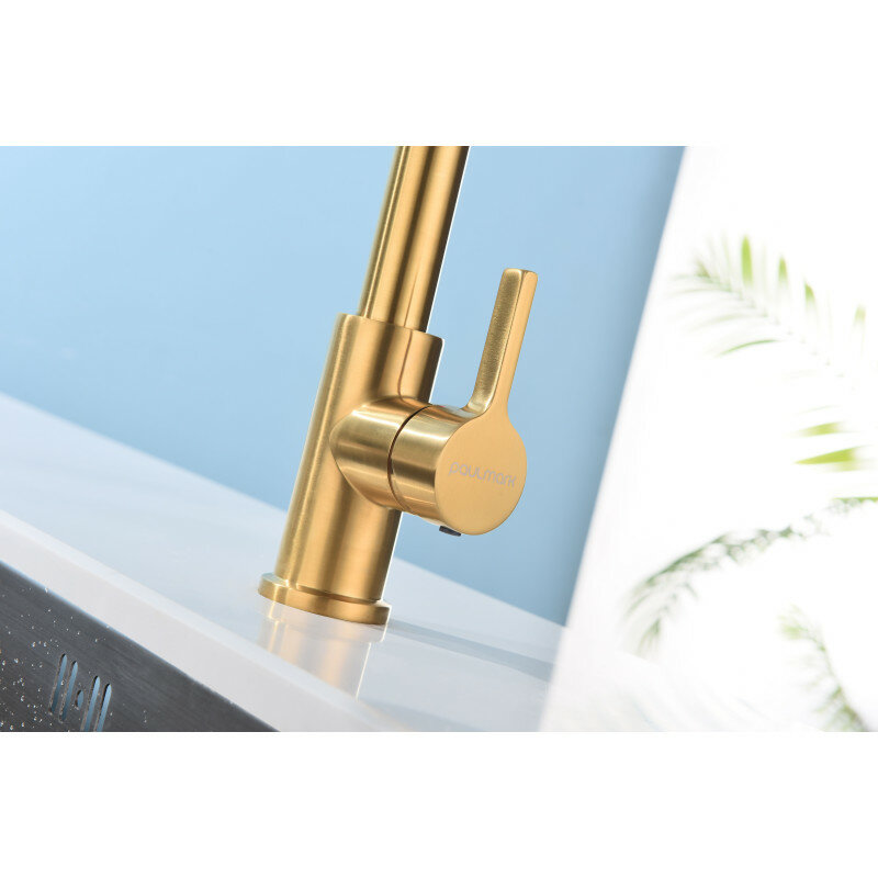 Смеситель для кухни из нержавеющей стали AISI 304 Paulmark HELLER с подключением к системе фильтрации воды, высокий поворотный на 360 излив, на мойку / столешницу, брашированное золото, He213218-BG