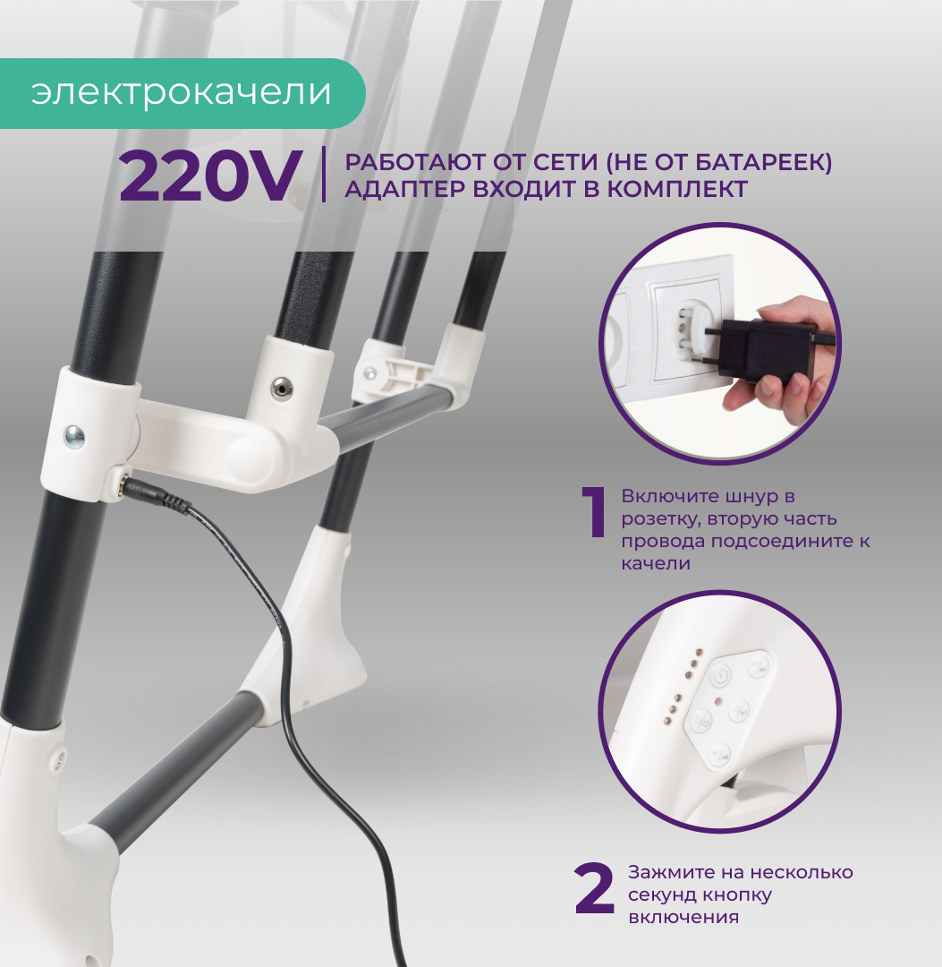 | Дополнительная информация | Электрокачели работают от сети, а не от аккумулятора. Электрокачели не нужно заряжать, нужно лишь воткнуть провод для питания в розетку. |