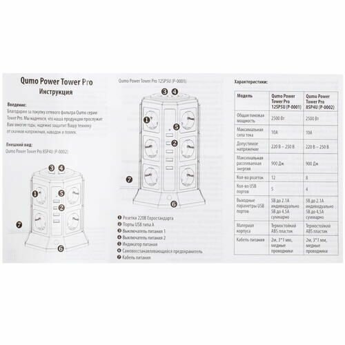 СохранитьQUMO Сетевой фильтр Power Tower Pro 12SP5U P-0001 , 12 розеток, 2200 Вт, 10A, кабель 2м 3 мм чистая медь, пожаробезопасный пластик, евровилка, 5 USB портов 4.5A суммарно 30556 интересное: