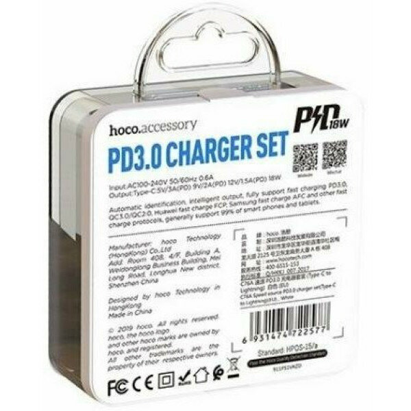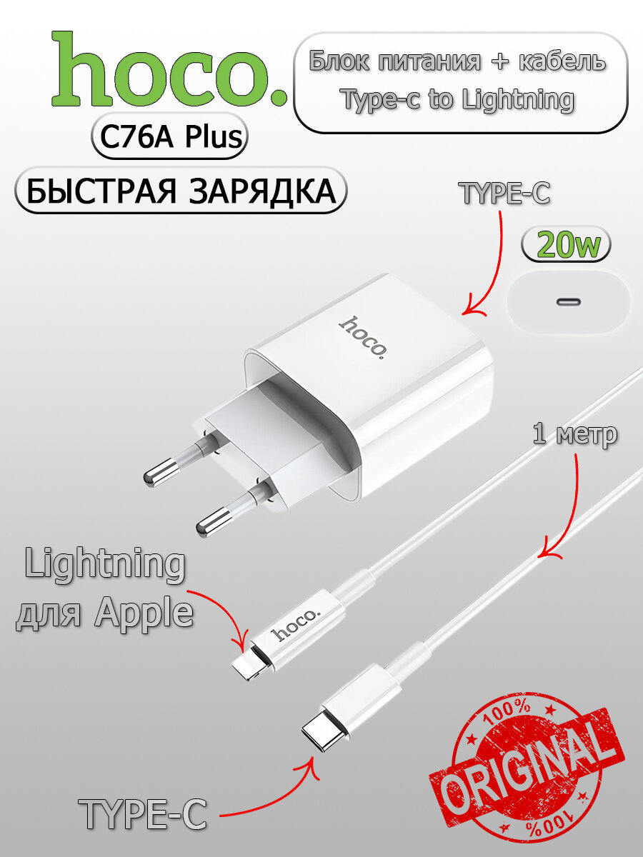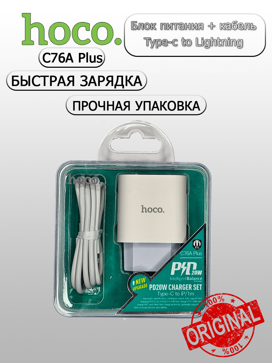 Сетевое зарядное устройство + кабель для iP Lighting to Type-C C76A PD 20W+QC3.0 3A HOCO белый интересное: